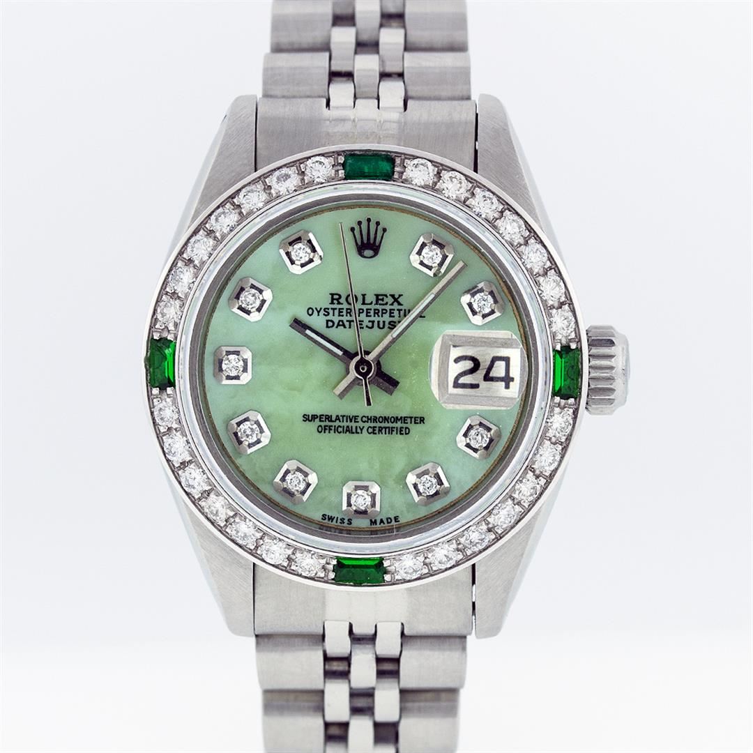 Ladies Rolex Datejust Polished Bright with Satin Finish, Serviced & Electronically Tested, Stainless Steel Case:26mm, Stainless Steel Crown, Custom Bezel: 18K White Gold Emerald Beadset Diamond Bezel, Diamond + Gem Count: 28 Diamonds + 4 Emeralds Total Weight .70 Carat, Clarity: SI-VS, Color: G to H. Custom Crystal: Synthetic Sapphire Cyclops Lens. Movement: Automatic Winding Movement Caliber 2030. Custom Dial: Refinished Green Mother Of Pearl With Diamond Hour Markers. Date Window: 3 O'Clock Position Date Display, Model: Datejust Condition: G-6 Extra Fine. Bracelet: Stainless Steel Jubilee. Bright Polish & Satin Finish. 5.5 Inch Length, Adjustable. Standard Clasp, With Rolex Logo.