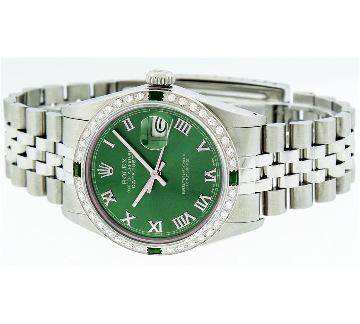 One Mens Rolex Datejust Polished Bright with Satin Finish, Serviced & Electronically Tested, Stainless Steel Case:36mm, Stainless Steel Crown, Custom Bezel: 18K White Gold Emerald Beadset Diamond Bezel, Diamond + Gem Count: 36 Diamonds + 4 Emeralds. Total Weight 1.00 Carat, Clarity: Si-VS, Color: G to H. Custom Crystal: Synthetic Sapphire Cyclops Lens. Movement: Automatic Winding Movement Caliber 3035. Custom Dial: Green Roman Dial With Square Track. Date Window: 3 O'Clock Position Date Display, Quickset, Model: Datejust. Condition: G-6 Extra Fine. Bracelet: Stainless Steel Jubilee. Bright Polish & Satin Finish. 7.0 Inch Length, Adjustable. Standard Clasp, With Rolex Logo. Comes with a 6 month warranty card.