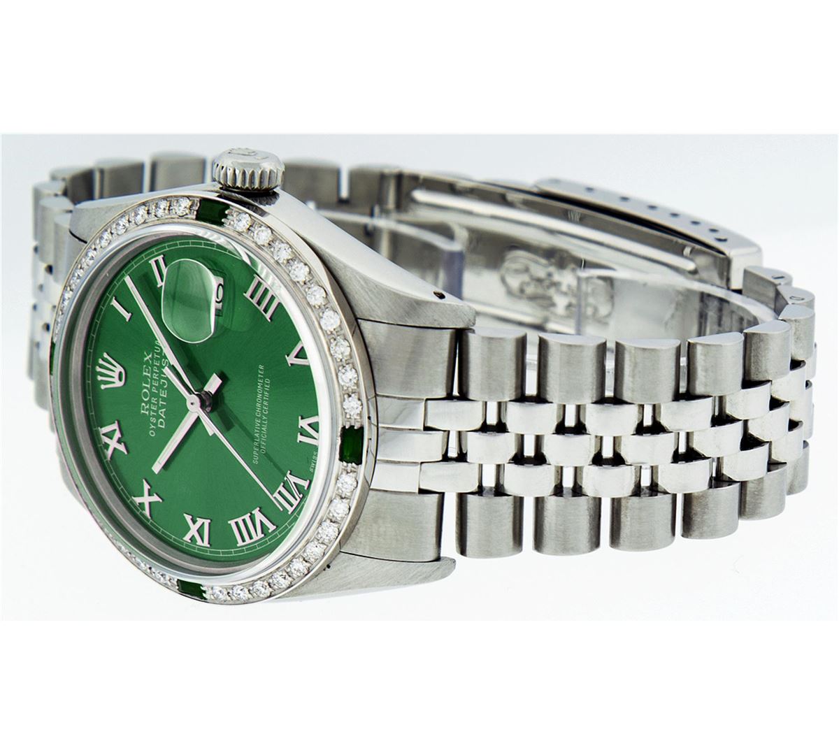 One Mens Rolex Datejust Polished Bright with Satin Finish, Serviced & Electronically Tested, Stainless Steel Case:36mm, Stainless Steel Crown, Custom Bezel: 18K White Gold Emerald Beadset Diamond Bezel, Diamond + Gem Count: 36 Diamonds + 4 Emeralds. Total Weight 1.00 Carat, Clarity: Si-VS, Color: G to H. Custom Crystal: Synthetic Sapphire Cyclops Lens. Movement: Automatic Winding Movement Caliber 3035. Custom Dial: Green Roman Dial With Square Track. Date Window: 3 O'Clock Position Date Display, Quickset, Model: Datejust. Condition: G-6 Extra Fine. Bracelet: Stainless Steel Jubilee. Bright Polish & Satin Finish. 7.0 Inch Length, Adjustable. Standard Clasp, With Rolex Logo. Comes with a 6 month warranty card.