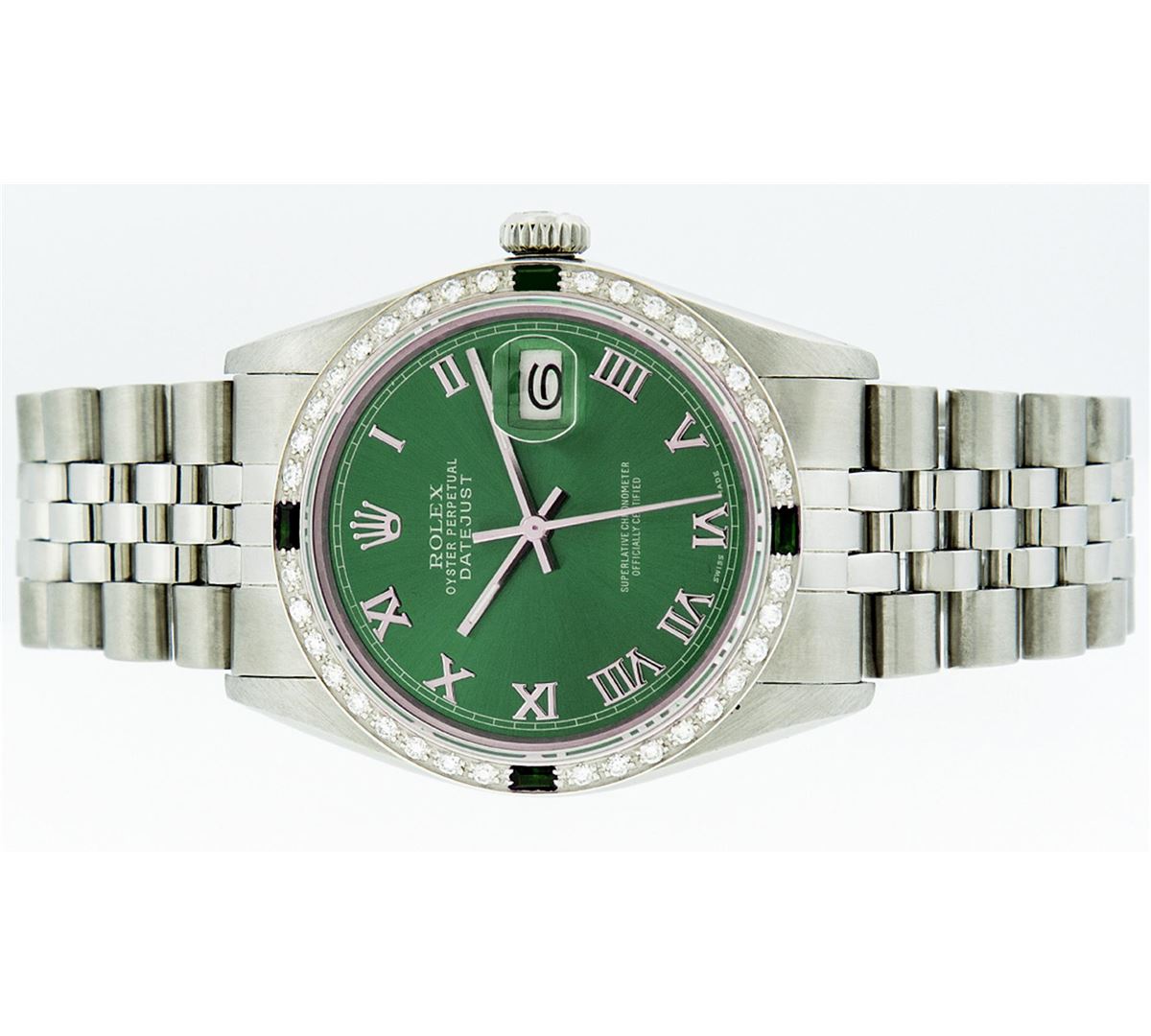 One Mens Rolex Datejust Polished Bright with Satin Finish, Serviced & Electronically Tested, Stainless Steel Case:36mm, Stainless Steel Crown, Custom Bezel: 18K White Gold Emerald Beadset Diamond Bezel, Diamond + Gem Count: 36 Diamonds + 4 Emeralds. Total Weight 1.00 Carat, Clarity: Si-VS, Color: G to H. Custom Crystal: Synthetic Sapphire Cyclops Lens. Movement: Automatic Winding Movement Caliber 3035. Custom Dial: Green Roman Dial With Square Track. Date Window: 3 O'Clock Position Date Display, Quickset, Model: Datejust. Condition: G-6 Extra Fine. Bracelet: Stainless Steel Jubilee. Bright Polish & Satin Finish. 7.0 Inch Length, Adjustable. Standard Clasp, With Rolex Logo. Comes with a 6 month warranty card.