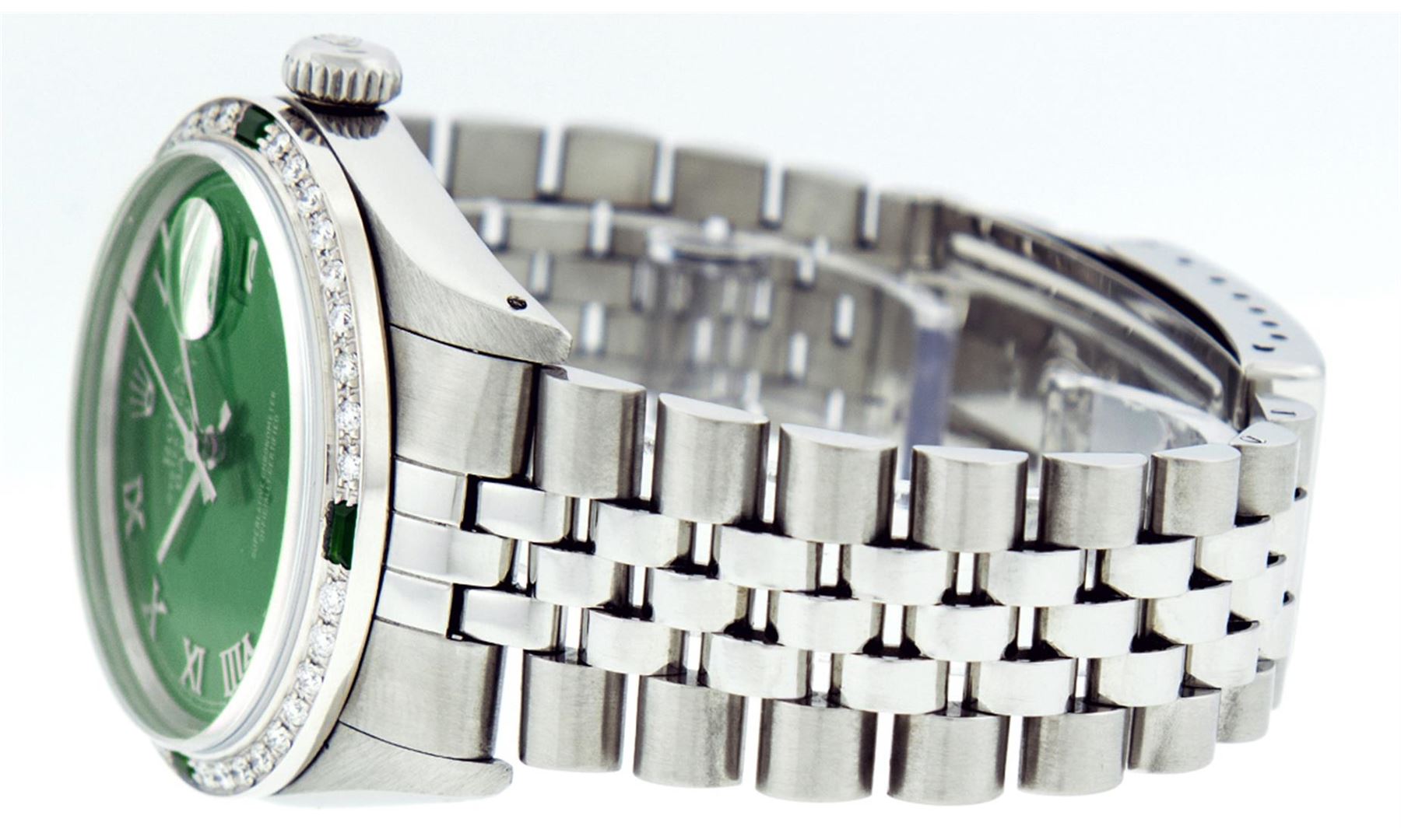 One Mens Rolex Datejust Polished Bright with Satin Finish, Serviced & Electronically Tested, Stainless Steel Case:36mm, Stainless Steel Crown, Custom Bezel: 18K White Gold Emerald Beadset Diamond Bezel, Diamond + Gem Count: 36 Diamonds + 4 Emeralds. Total Weight 1.00 Carat, Clarity: Si-VS, Color: G to H. Custom Crystal: Synthetic Sapphire Cyclops Lens. Movement: Automatic Winding Movement Caliber 3035. Custom Dial: Green Roman Dial With Square Track. Date Window: 3 O'Clock Position Date Display, Quickset, Model: Datejust. Condition: G-6 Extra Fine. Bracelet: Stainless Steel Jubilee. Bright Polish & Satin Finish. 7.0 Inch Length, Adjustable. Standard Clasp, With Rolex Logo. Comes with a 6 month warranty card.