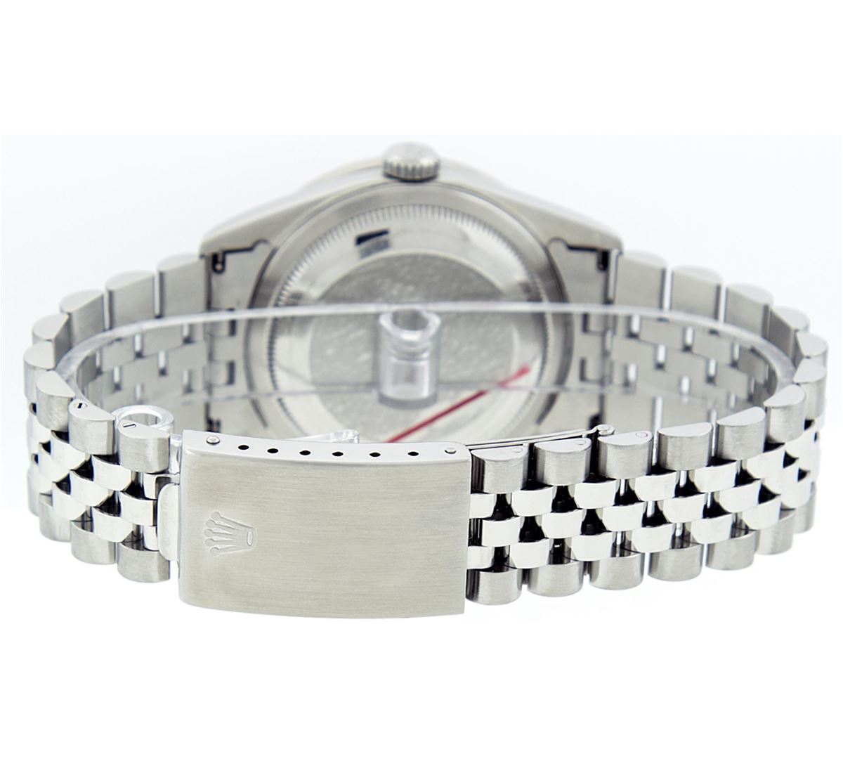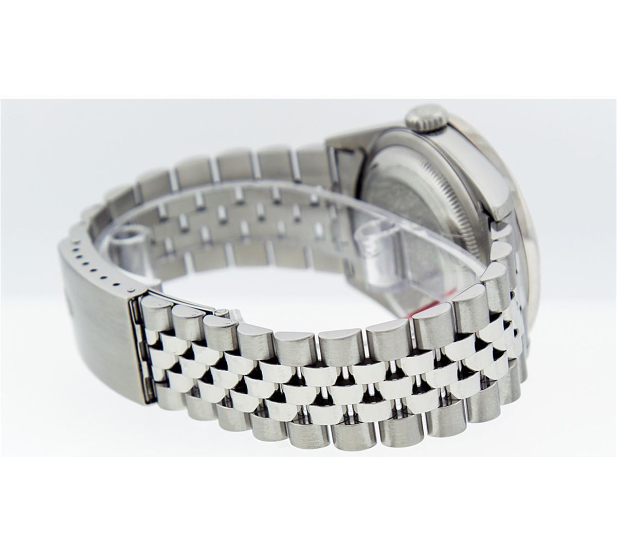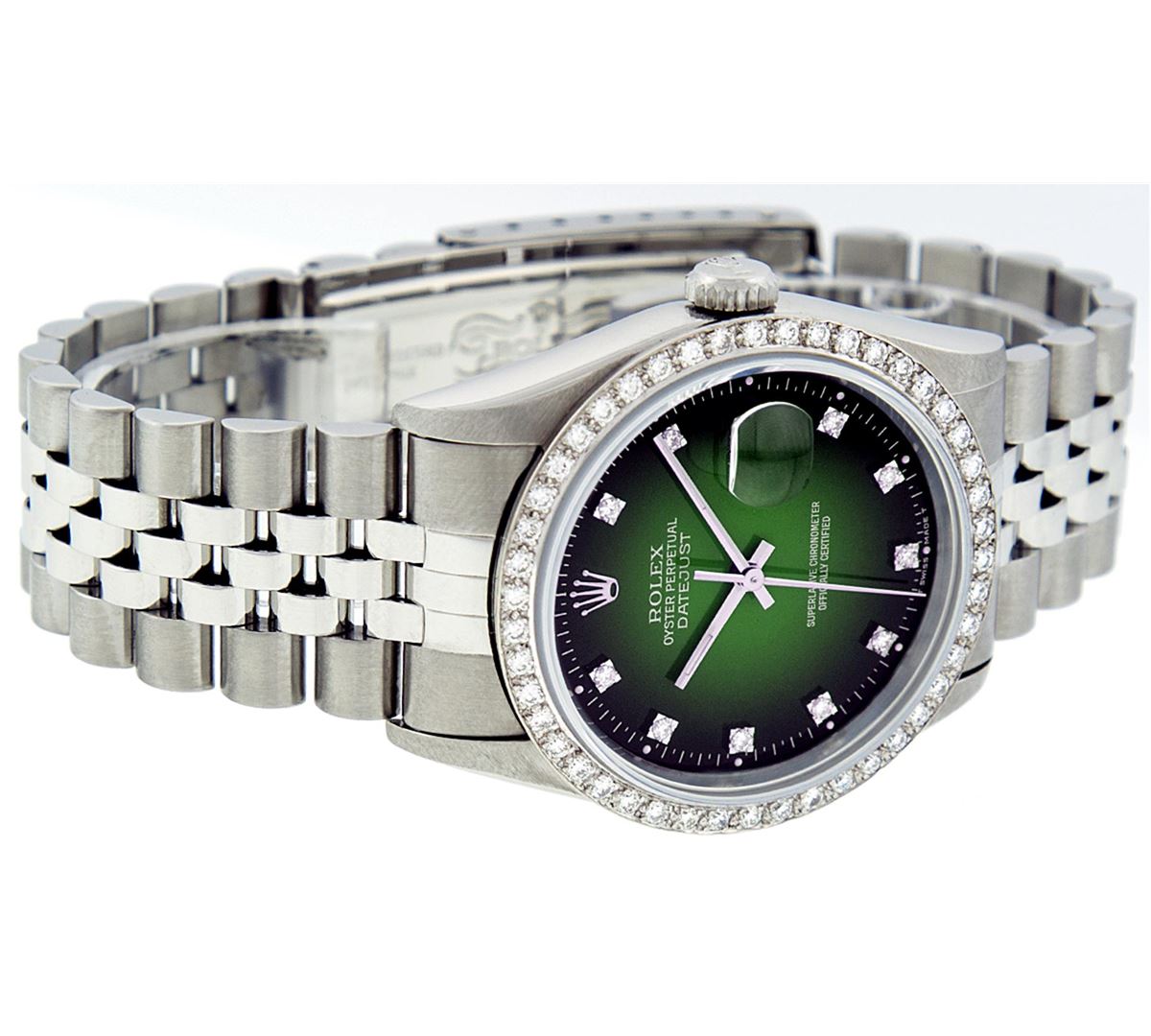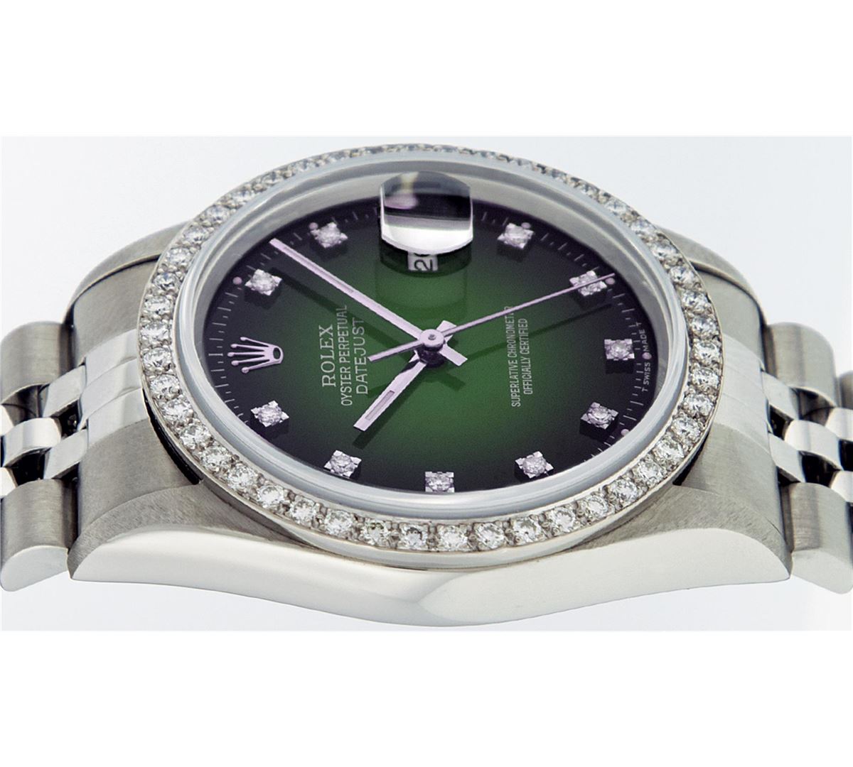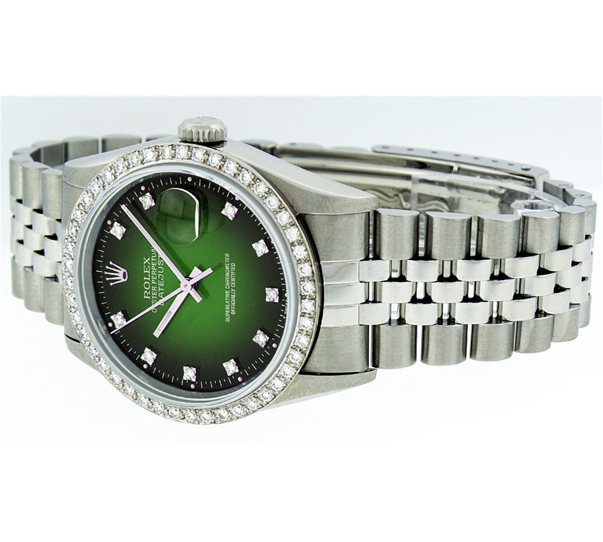 One Mens Stainless Steel Rolex Datejust Polished Bright with Satin Finish, Fully Serviced & Electronically Tested, Stainless Steel Case:36mm, Stainless Steel Crown, Custom Bezel: 18K White Gold Beadset Diamond Bezel, Diamond Count: 46 Diamonds Total Weight 1.40 Carat, Clarity: SI-VS, Color: G to H. Custom Crystal: Synthetic Sapphire Cyclops Lens. Movement: Automatic Winding Movement Caliber 3035. Custom Dial: Green Vignette Diamond With Line Track & Lumi Dots, 10 Single Cut Diamonds in Dial G To H In Color, Clarity: VVS. Date Window: 3 O'Clock Position Date Display, Quickset, Model: Datejust, Condition: G-6 Extra Fine. Bracelet: Stainless Steel Jubilee. Bright Polish & Satin Finish. 7.0 Inch Length, Adjustable. Standard Clasp, With Rolex Logo.