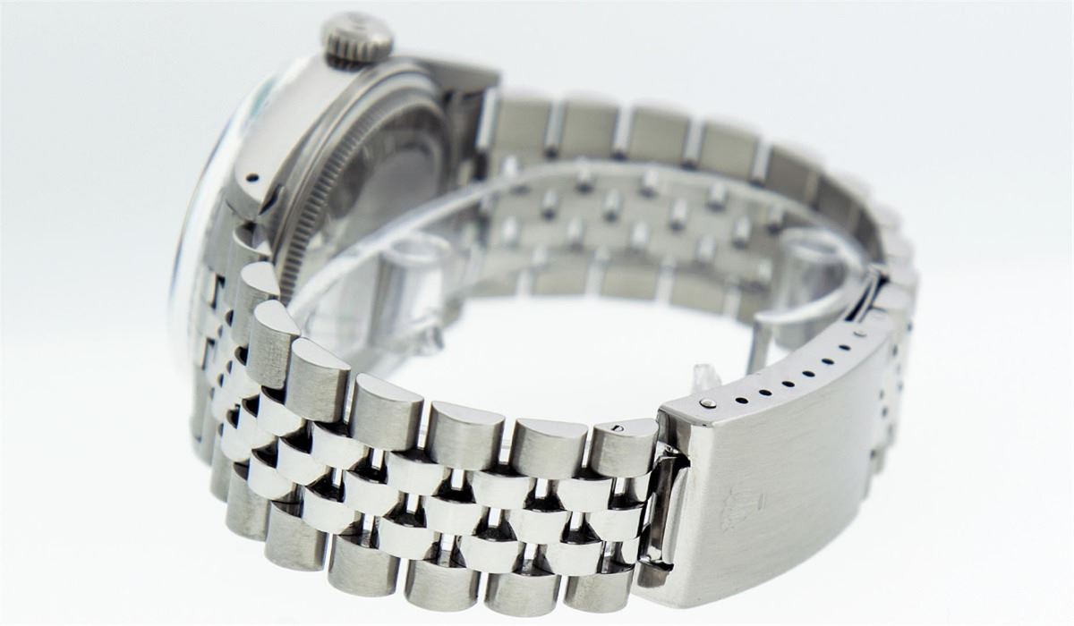 One Gents Rolex Datejust Polished Bright with Satin Finish, Serviced & Electronically Tested, Stainless Steel Case:36mm, Stainless Steel Crown, Original Bezel: 14K White Gold Fluted Bezel. Custom Crystal: Acrylic Cyclops Lens. Movement: Automatic Winding Movement Caliber 3035. Custom Dial: Ice Blue Dial With Diamond Hour Markers and Track Square Setting, 10 Diamond in Dial G To H In Color, Si-VS Clarity. Date Window: 3 O'Clock Position Date Display, Quickset, Model: Datejust, Condition: G-6 Extra Fine. Bracelet: Stainless Steel Jubilee. Bright Polish & Satin Finish. 7.0 Inch Length, Adjustable. Standard Clasp, With Rolex Logo. Comes with a 6 month warranty card.