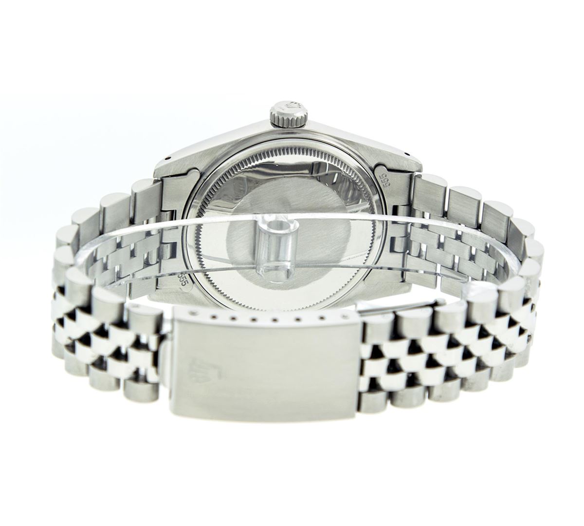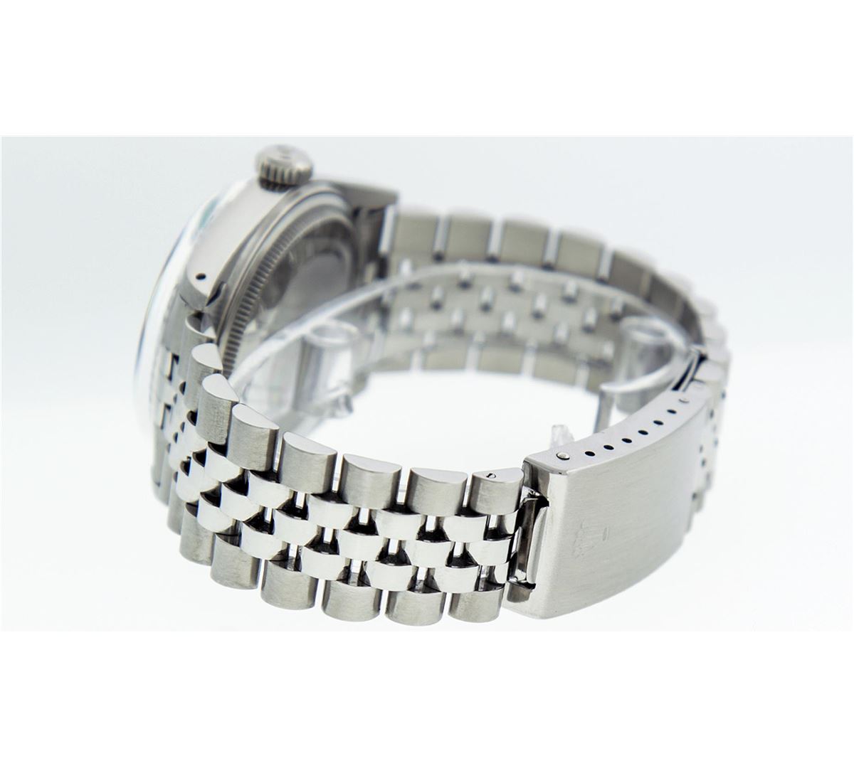 One Gents Rolex Datejust Polished Bright with Satin Finish, Serviced & Electronically Tested, Stainless Steel Case:36mm, Stainless Steel Crown, Original Bezel: 14K White Gold Fluted Bezel. Custom Crystal: Acrylic Cyclops Lens. Movement: Automatic Winding Movement Caliber 3035. Custom Dial: Ice Blue Dial With Diamond Hour Markers and Track Square Setting, 10 Diamond in Dial G To H In Color, Si-VS Clarity. Date Window: 3 O'Clock Position Date Display, Quickset, Model: Datejust, Condition: G-6 Extra Fine. Bracelet: Stainless Steel Jubilee. Bright Polish & Satin Finish. 7.0 Inch Length, Adjustable. Standard Clasp, With Rolex Logo. Comes with a 6 month warranty card.