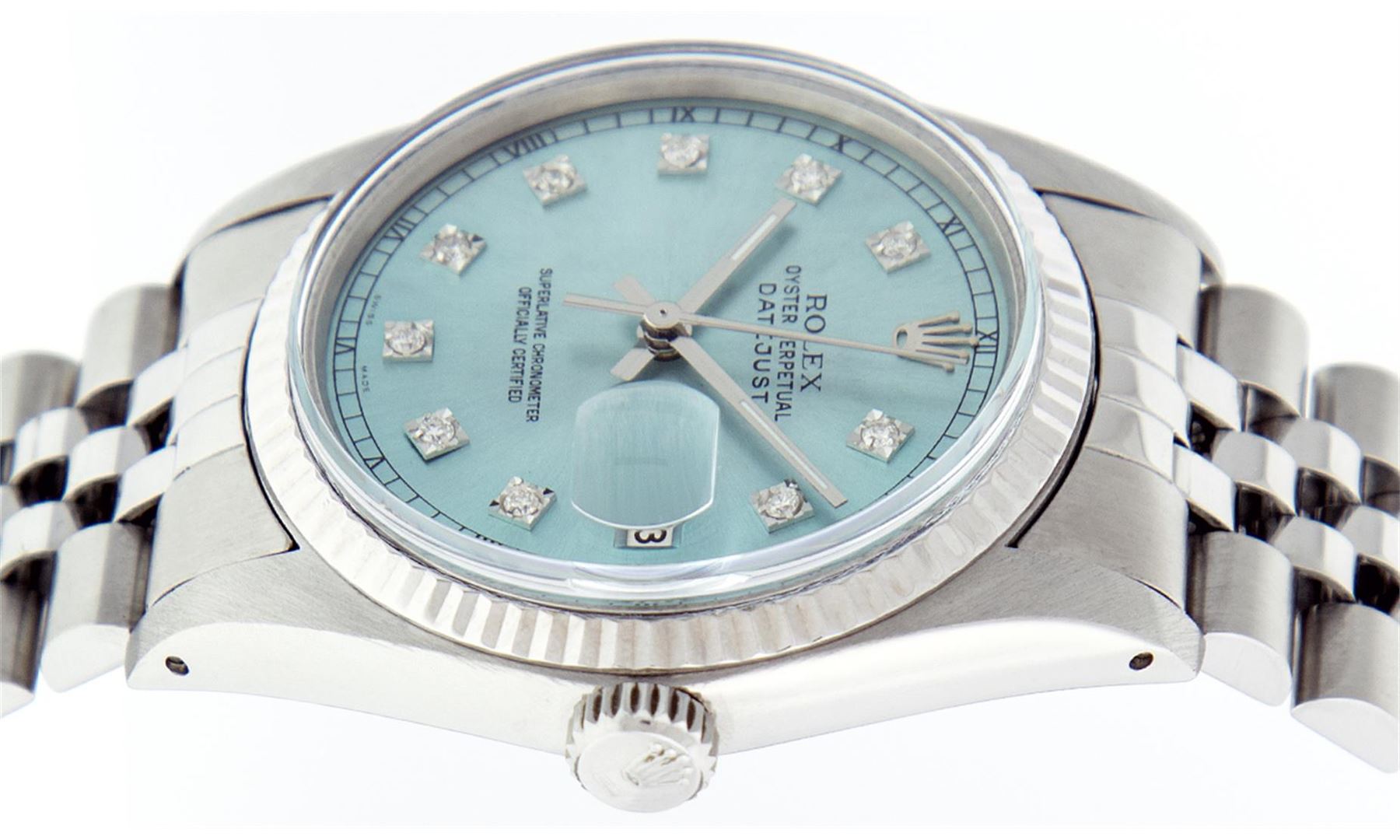 One Gents Rolex Datejust Polished Bright with Satin Finish, Serviced & Electronically Tested, Stainless Steel Case:36mm, Stainless Steel Crown, Original Bezel: 14K White Gold Fluted Bezel. Custom Crystal: Acrylic Cyclops Lens. Movement: Automatic Winding Movement Caliber 3035. Custom Dial: Ice Blue Dial With Diamond Hour Markers and Track Square Setting, 10 Diamond in Dial G To H In Color, Si-VS Clarity. Date Window: 3 O'Clock Position Date Display, Quickset, Model: Datejust, Condition: G-6 Extra Fine. Bracelet: Stainless Steel Jubilee. Bright Polish & Satin Finish. 7.0 Inch Length, Adjustable. Standard Clasp, With Rolex Logo. Comes with a 6 month warranty card.