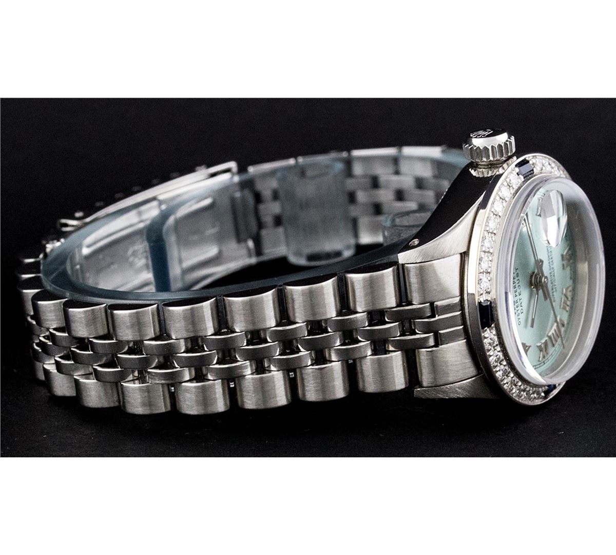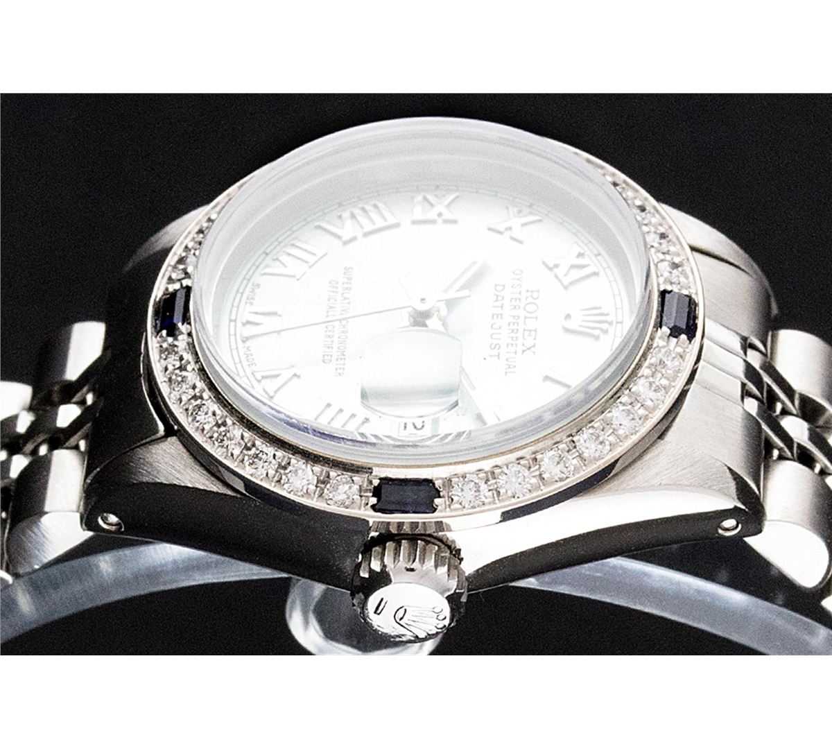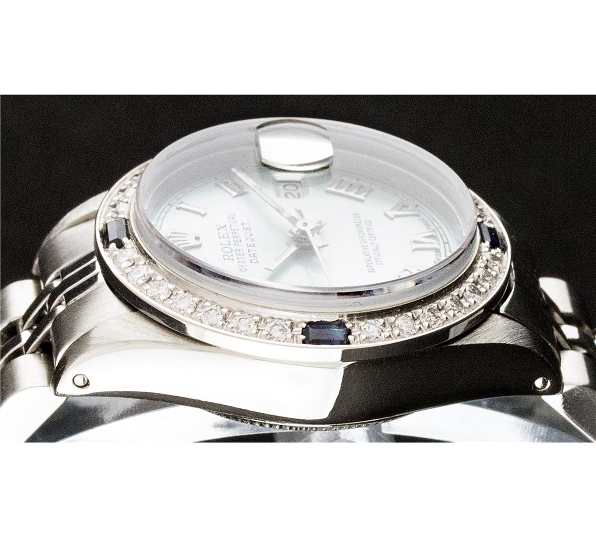 One Ladies Rolex Datejust Polished Bright with Satin Finish, Serviced & Electronically Tested, Stainless Steel Case:26mm, Stainless Steel Crown, Custom Bezel: 18K White Gold Sapphire Beadset Diamond Bezel, Diamond + Gem Count: 28 Diamonds + 4 Sapphires Total Weight .70 Carat, Clarity: Si-VS, Color: G to H. Custom Crystal: Synthetic Sapphire Cyclops Lens. Movement: Automatic Winding Movement Caliber 2030. Custom Dial: Ice Blue Roman Dial. Date Window: 3 O'Clock Position Date Display, Non Quickset, Model: 6917 Condition: G-6 Extra Fine. Bracelet: Stainless Steel Jubilee. Bright Polish & Satin Finish. 5.5 Inch Length, Adjustable. Standard Clasp, With Rolex Logo.