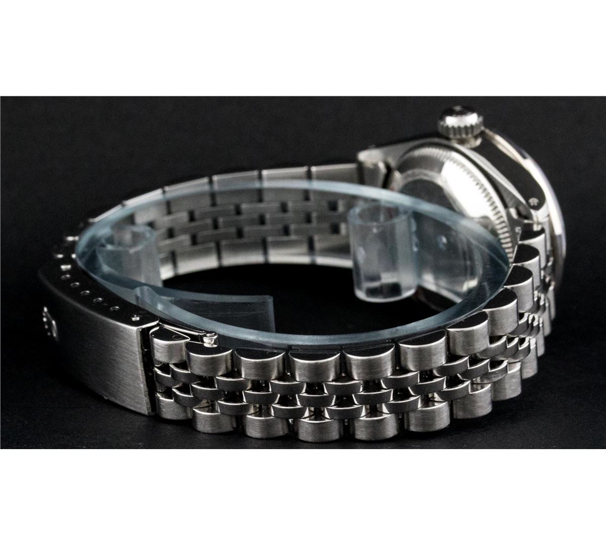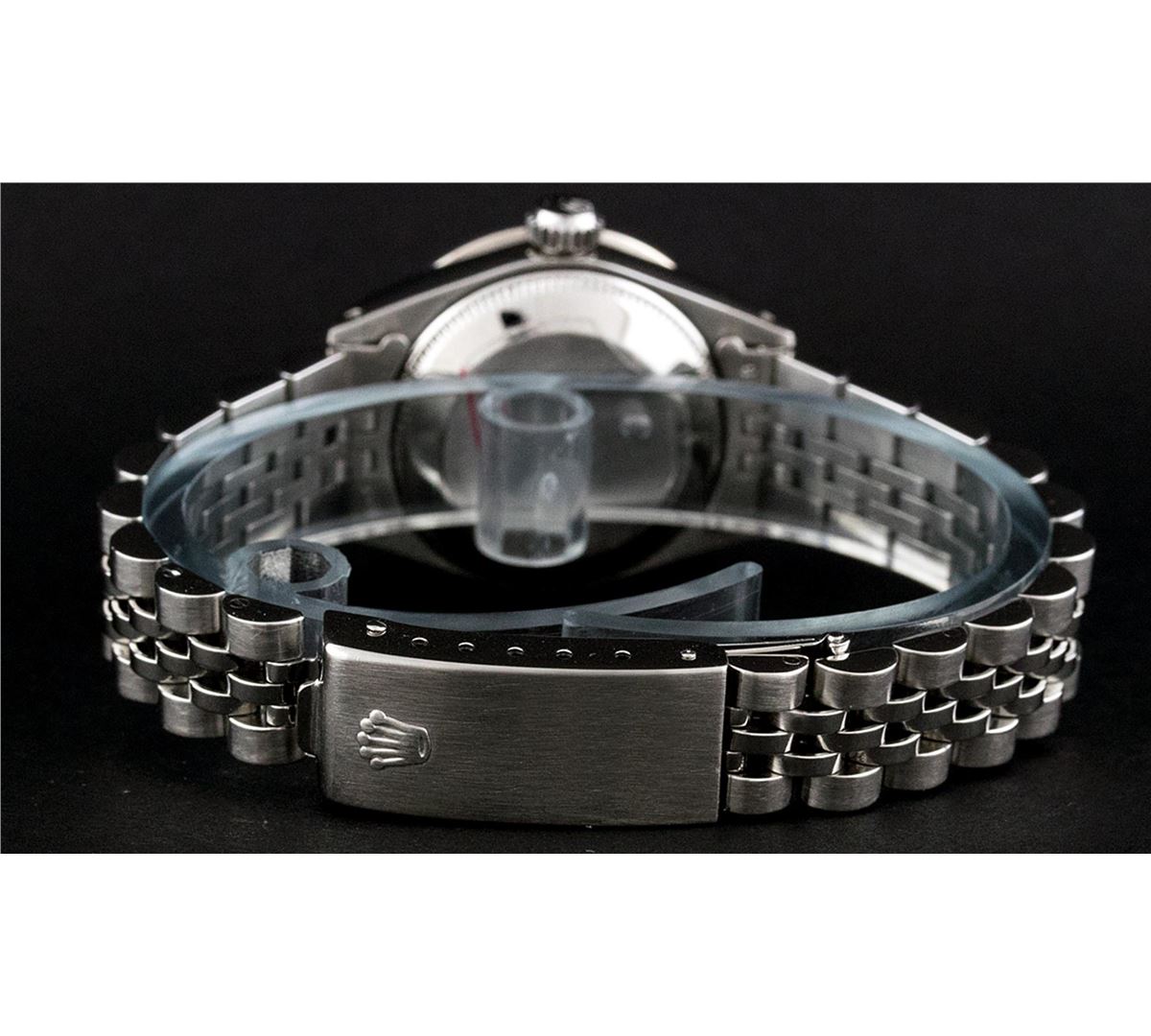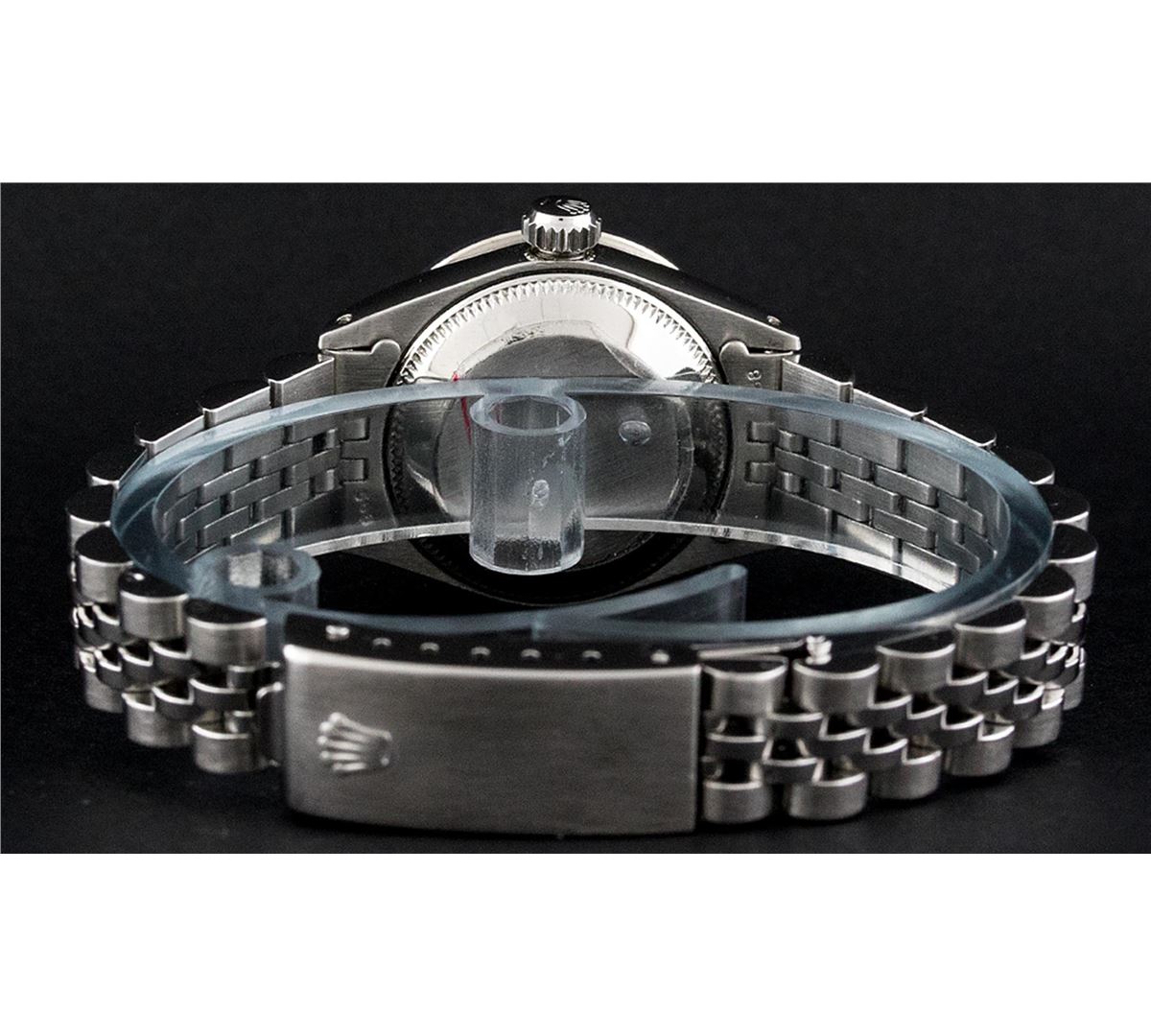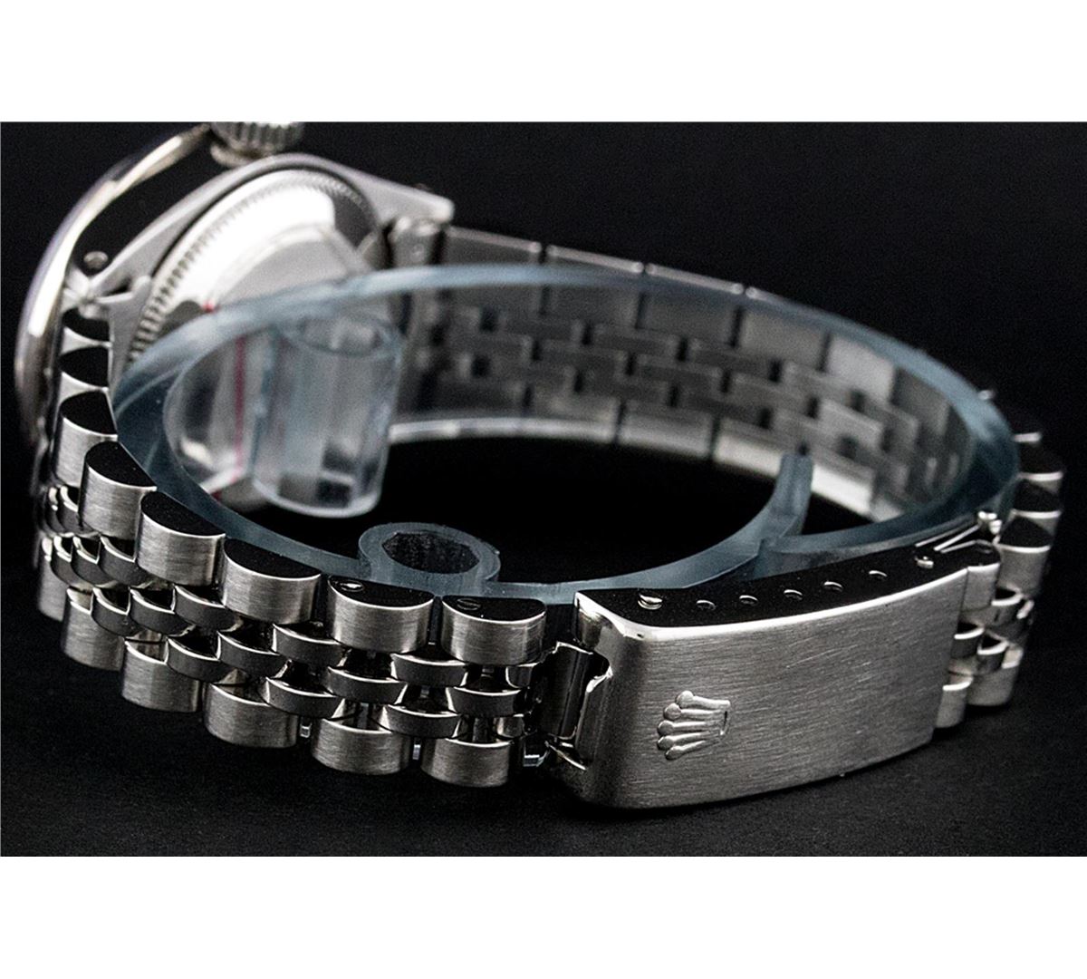 One Ladies Rolex Datejust Polished Bright with Satin Finish, Serviced & Electronically Tested, Stainless Steel Case:26mm, Stainless Steel Crown, Custom Bezel: 18K White Gold Sapphire Beadset Diamond Bezel, Diamond + Gem Count: 28 Diamonds + 4 Sapphires Total Weight .70 Carat, Clarity: Si-VS, Color: G to H. Custom Crystal: Synthetic Sapphire Cyclops Lens. Movement: Automatic Winding Movement Caliber 2030. Custom Dial: Ice Blue Roman Dial. Date Window: 3 O'Clock Position Date Display, Non Quickset, Model: 6917 Condition: G-6 Extra Fine. Bracelet: Stainless Steel Jubilee. Bright Polish & Satin Finish. 5.5 Inch Length, Adjustable. Standard Clasp, With Rolex Logo.