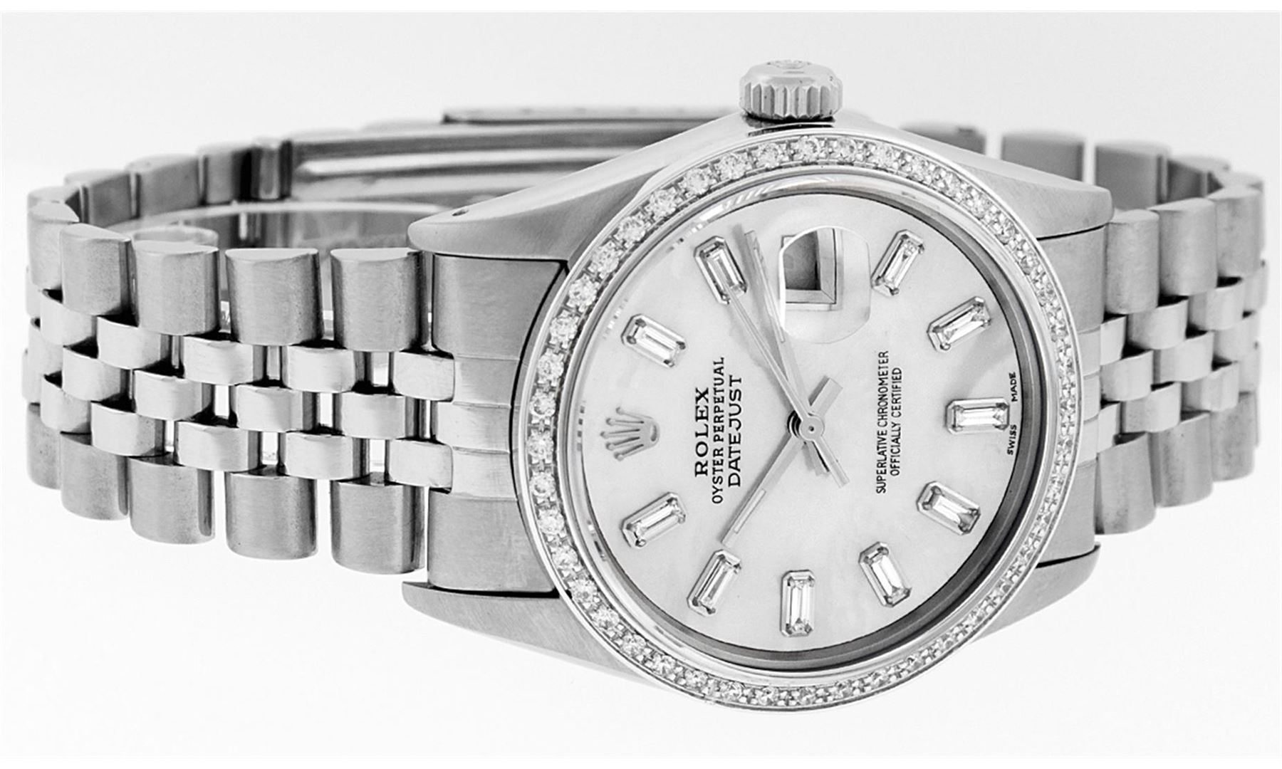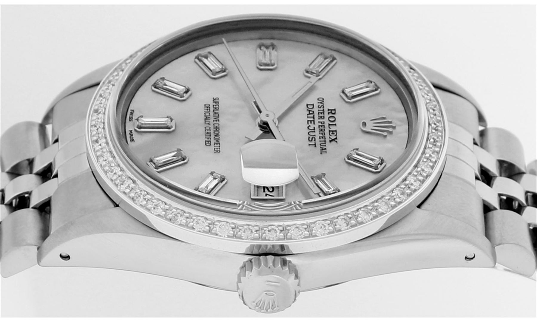 One Gents Rolex Datejust Polished, Serviced & Electronically Tested, Stainless Steel Case:36mm, Stainless Steel Crown, Custom Bezel: 18K White Gold Beadset Diamond Bezel, Diamond Count: 44 Diamonds, Total Weight 1.00 Carat, Clarity: SI-VS, Color: G to H. Custom Crystal: Synthetic Sapphire Cyclops Lens. Movement: Automatic Winding Movement Caliber 3035. Custom Dial: MOP Baguette Diamond Hour Markers, Diamond Count: 10 Diamond Baguette. G To H In Color, Clarity: SI-VS. Date Window: 3 O'Clock Position Date Display, Quickset, Model: Datejust. Condition: G-6 Extra Fine. Bracelet: Stainless Steel Jubilee. Bright Polish & Satin Finish. 7.0 Inch Length, Adjustable. Standard Clasp, With Rolex Logo. Comes with 6 month warranty.