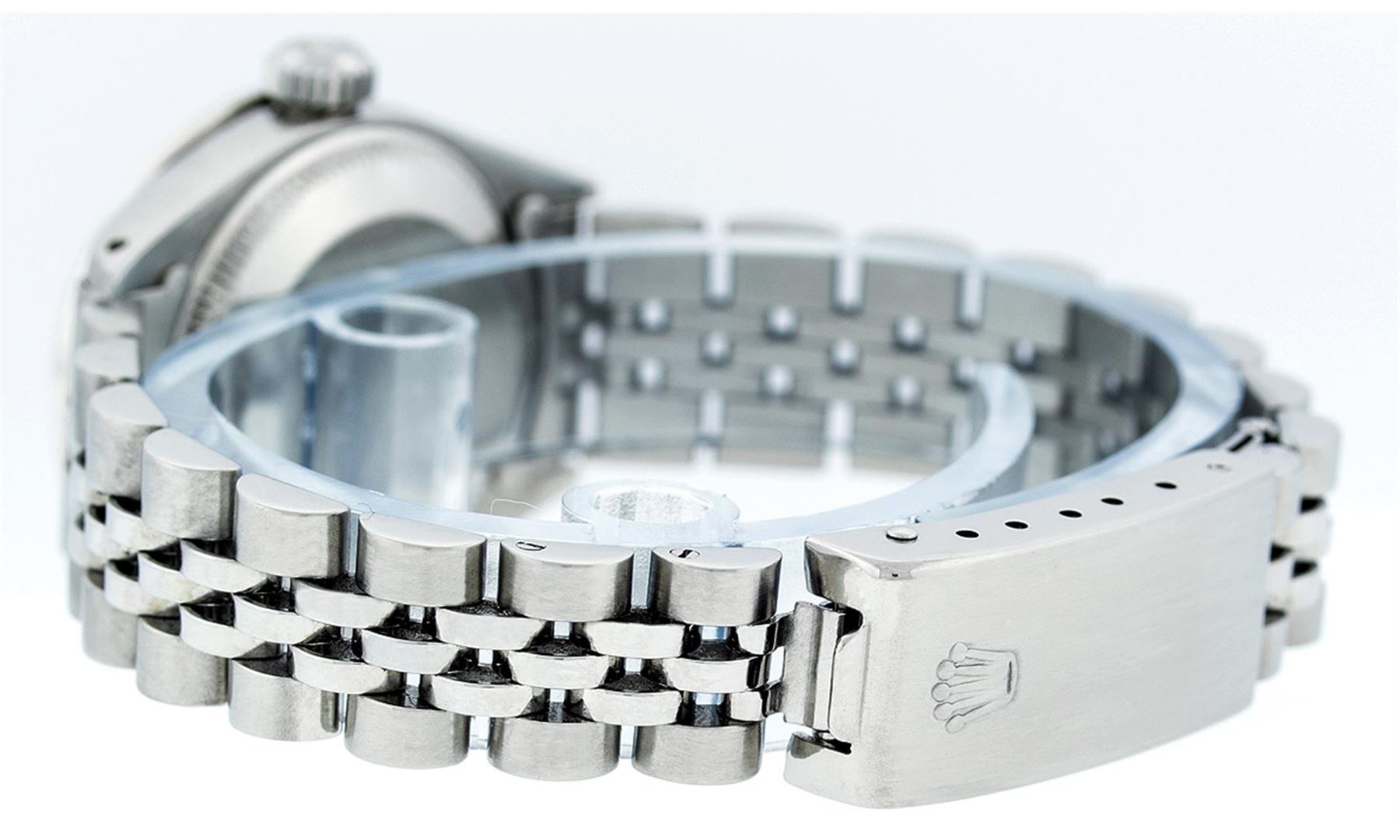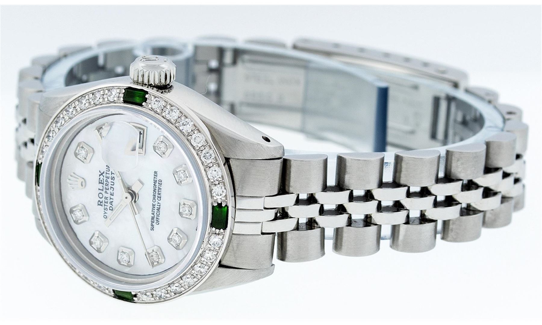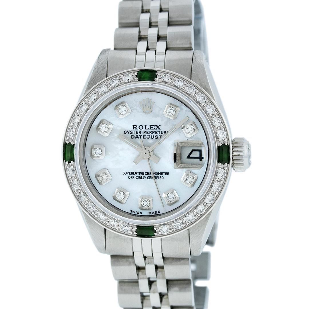One Ladies Rolex Datejust Polished Bright with Satin Finish, Serviced & Electronically Tested, Stainless Steel Case:26mm, Stainless Steel Crown, Custom Bezel: 18K White Gold Emerald Beadset Diamond Bezel, Diamond + Gem Count: 28 Diamonds + 4 Emeralds. Total Weight .70 Carat, Clarity: SI-VS, Color: G to H. Custom Crystal: Synthetic Sapphire Cyclops Lens. Movement: Automatic Winding Movement Caliber 2030. Custom Dial: Refinished Mother Of Pearl With Diamond Hour Markers, 10 Diamond in Dial G To H In Color, Clarity: SI-VS. Date Window: 3 O'Clock Position Date Display, Model: Datejust. Condition: G-6 Extra Fine. Bracelet: Stainless Steel Jubilee. Bright Polish & Satin Finish. 5.5 Inch Length, Adjustable. Standard Clasp, With Rolex Logo. Comes with 6 month warranty.