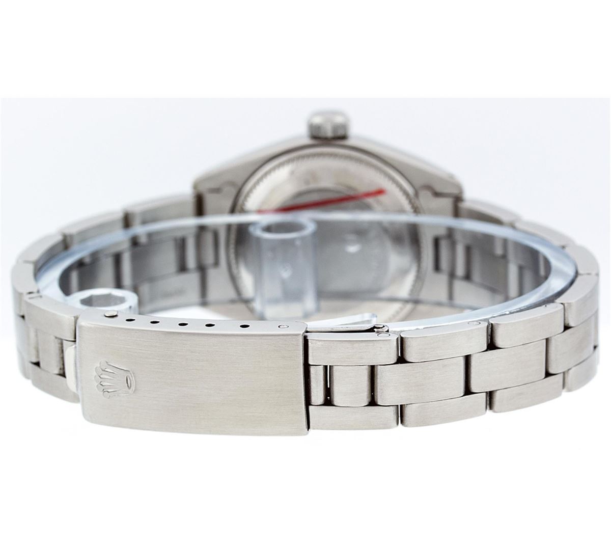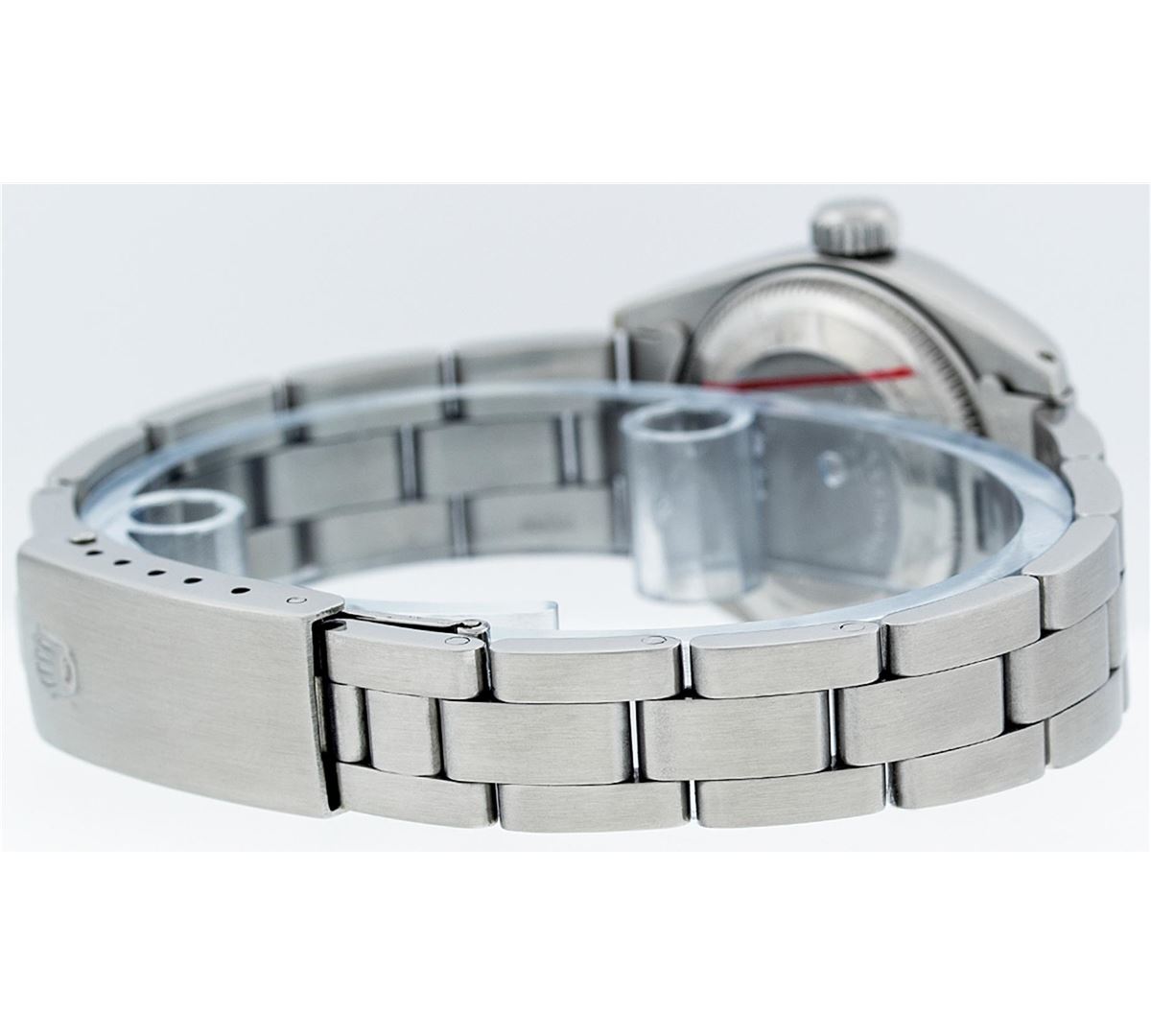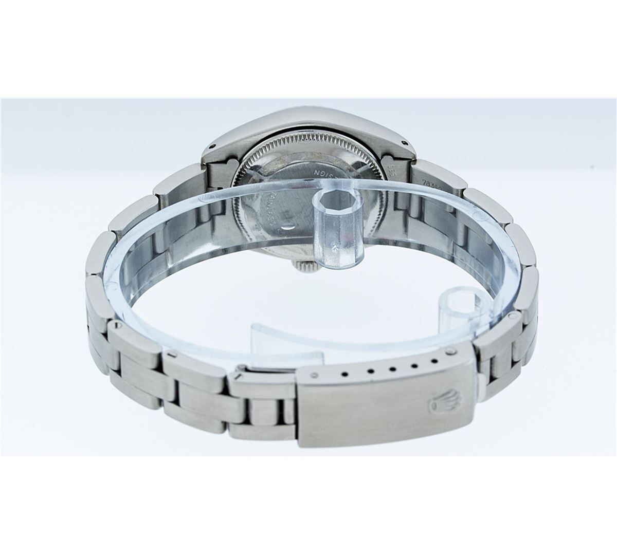One Ladies Rolex Datejust Polished Bright with Satin Finish, Serviced & Electronically Tested, Stainless Steel Case:26mm, Stainless Steel Crown, Bezel: 14K White Gold Fluted. Custom Crystal: Acrylic Cyclops Lens. Movement: Automatic Winding Movement Caliber 2030. Custom Dial: Mother Of Pearl With Diamond Hour Markers, Diamond Count: 10 Diamonds, Clarity: SI-VS, Color: G to H. Date Window: 3 O'Clock Position Date Display, Model: Datejust. Condition: G-6 Extra Fine. Bracelet: Stainless Steel Oyster Band. Bright Polish & Satin Finish. 6.0 Inch Length, Adjustable. Standard Clasp, With Rolex Logo. Comes with 6 month warranty.