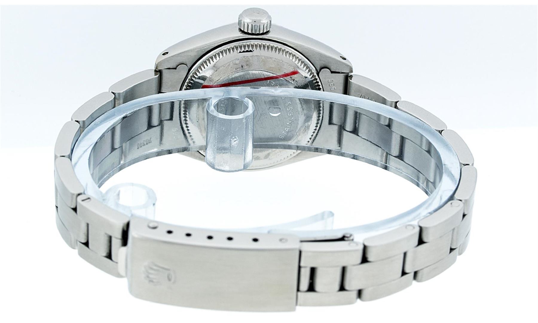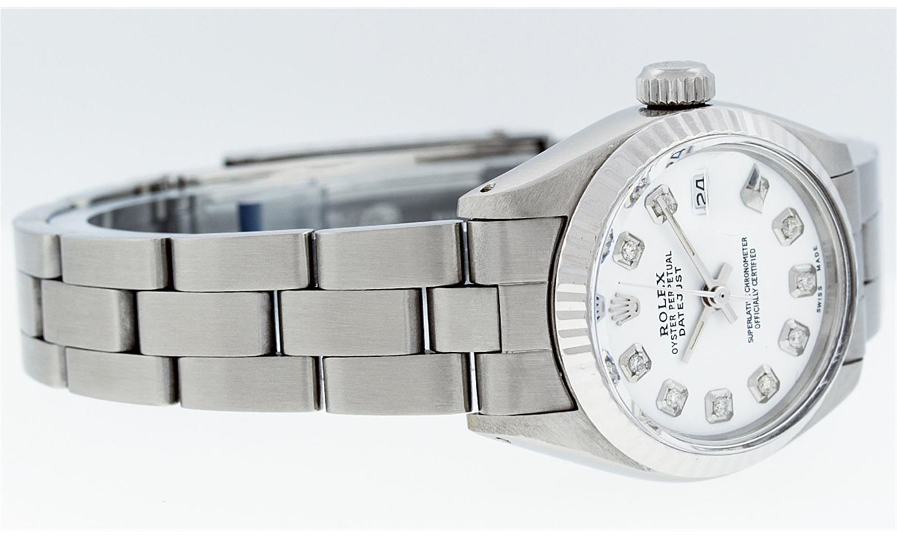 One Ladies Rolex Datejust Polished Bright with Satin Finish, Serviced & Electronically Tested, Stainless Steel Case:26mm, Stainless Steel Crown, Bezel: 14K White Gold Fluted. Custom Crystal: Acrylic Cyclops Lens. Movement: Automatic Winding Movement Caliber 2030. Custom Dial: Mother Of Pearl With Diamond Hour Markers, Diamond Count: 10 Diamonds, Clarity: SI-VS, Color: G to H. Date Window: 3 O'Clock Position Date Display, Model: Datejust. Condition: G-6 Extra Fine. Bracelet: Stainless Steel Oyster Band. Bright Polish & Satin Finish. 6.0 Inch Length, Adjustable. Standard Clasp, With Rolex Logo. Comes with 6 month warranty.