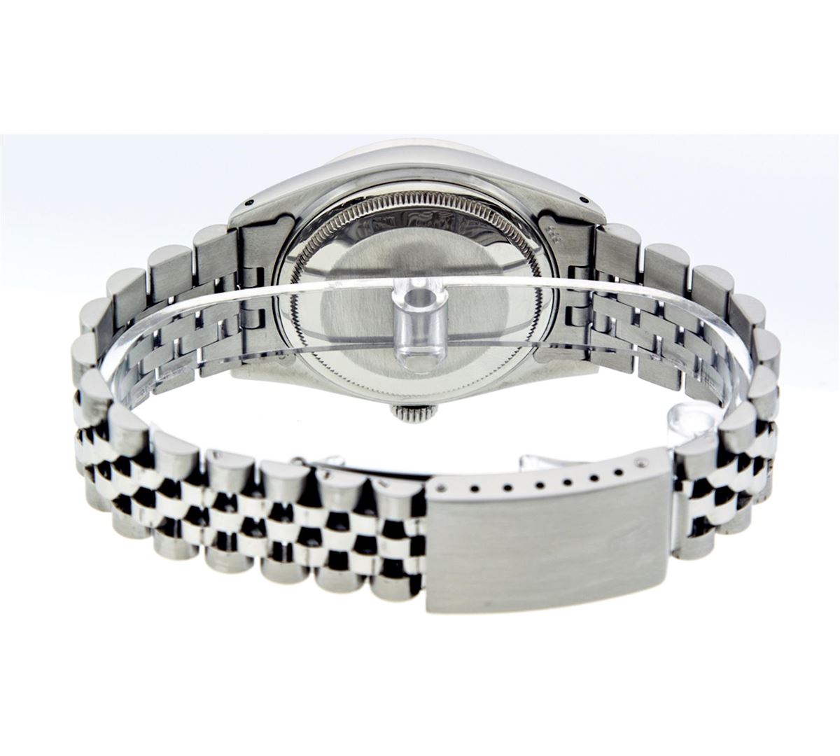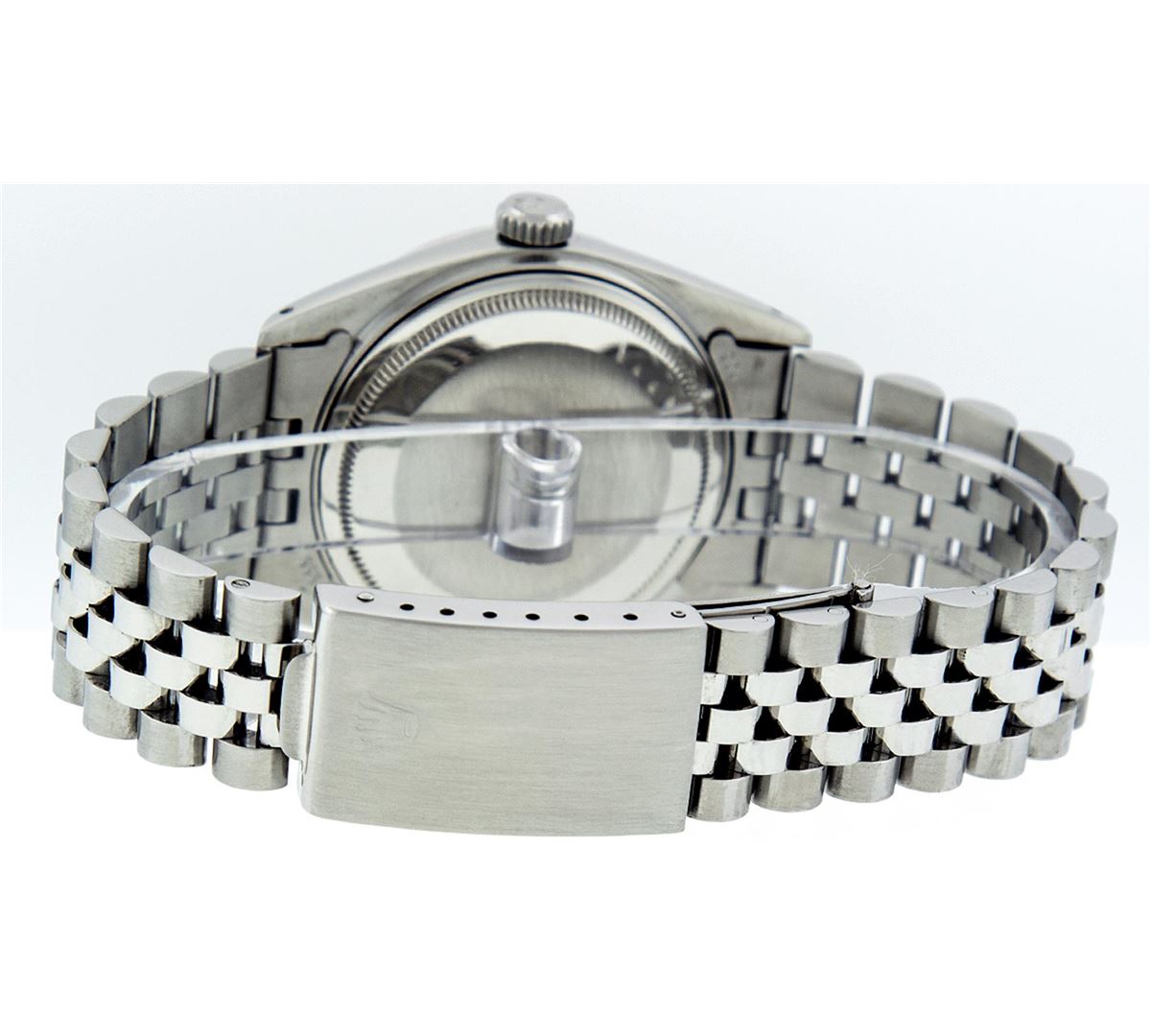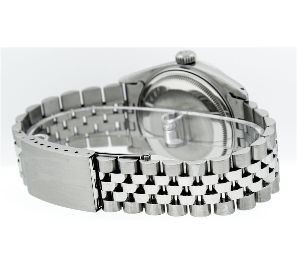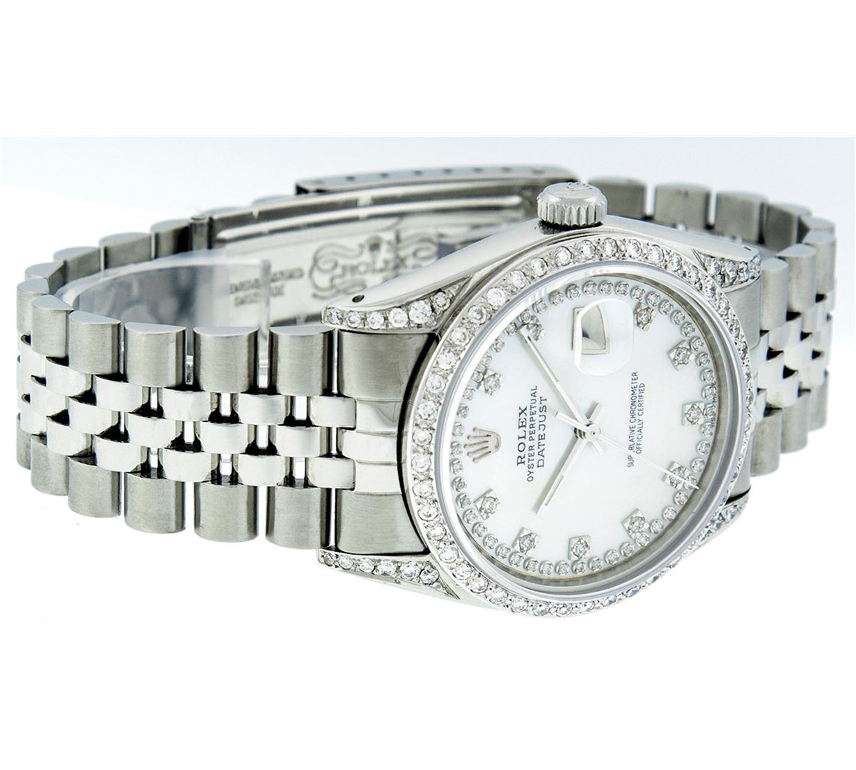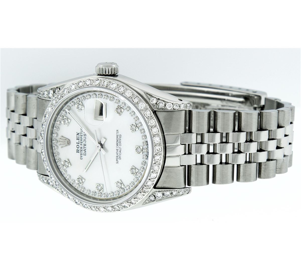 One Gents Rolex Datejust Polished, Serviced & Electronically Tested, Stainless Steel Case:36mm, Stainless Steel Crown, Custom Bezel: 18K White Gold Beadset Diamond Bezel, Diamond Count: 44 Diamonds. Total Weight 1.0 Carat, Clarity: SI-VS, Color: G to H. Custom Crystal: Synthetic Sapphire Cyclops Lens. Movement: Automatic Winding Movement Caliber 3035. Custom Dial: Mother Of Pearl String Diamond Dial VVS, Diamond Count: 58 Diamond In Dial G To H In Color, Clarity: VVS. Date Window: 3 O'Clock Position Date Display, Quickset, Model: Datejust Condition: G-6 Extra Fine. Bracelet: Stainless Steel Jubilee. Bright Polish & Satin Finish. 7.0 Inch Length, Adjustable. Standard Clasp, With Rolex Logo.