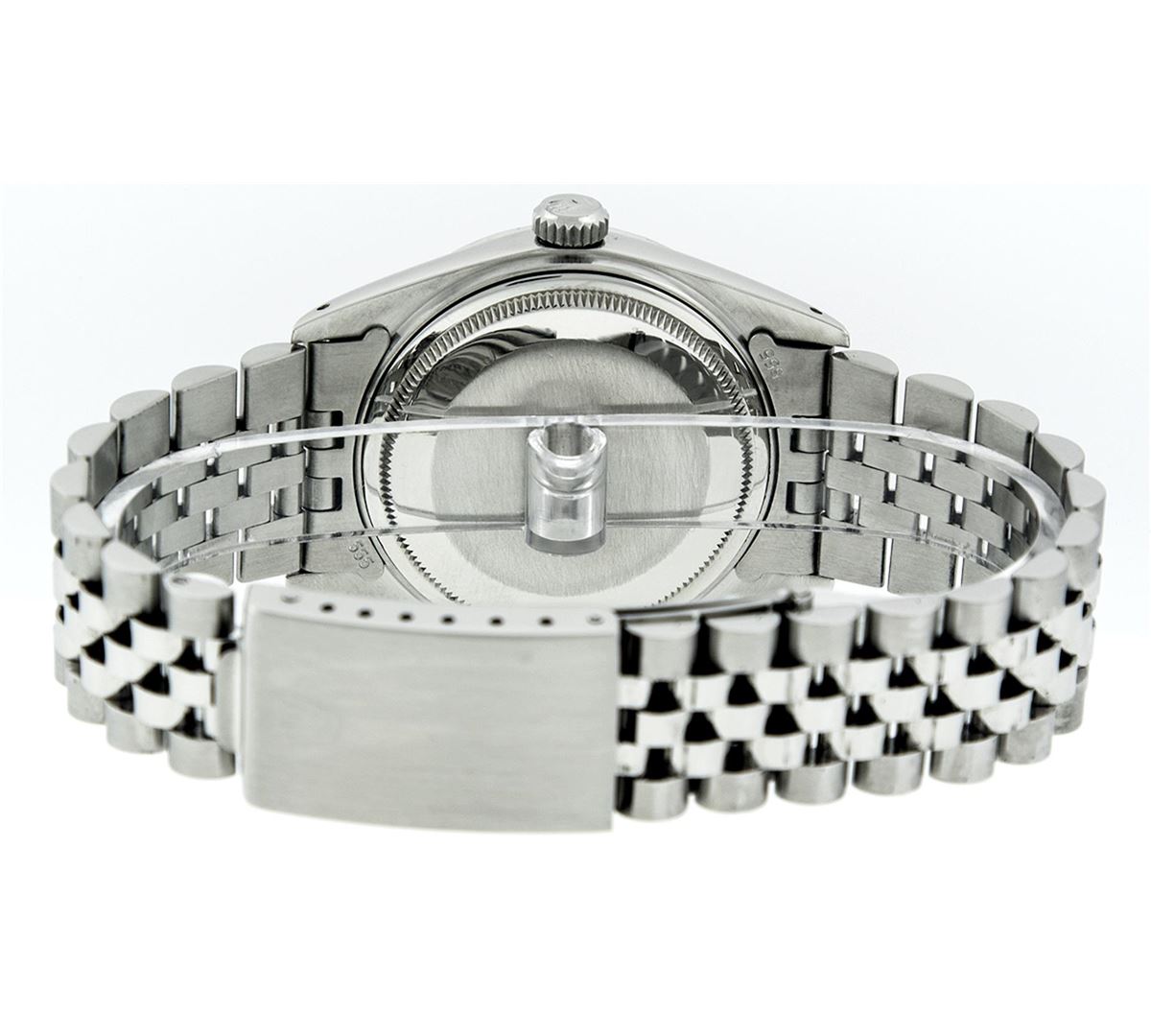 One Gents Rolex Datejust Polished, Serviced & Electronically Tested, Stainless Steel Case:36mm, Stainless Steel Crown, Custom Bezel: 18K White Gold Beadset Diamond Bezel, Diamond Count: 44 Diamonds. Total Weight 1.0 Carat, Clarity: SI-VS, Color: G to H. Custom Crystal: Synthetic Sapphire Cyclops Lens. Movement: Automatic Winding Movement Caliber 3035. Custom Dial: Mother Of Pearl String Diamond Dial VVS, Diamond Count: 58 Diamond In Dial G To H In Color, Clarity: VVS. Date Window: 3 O'Clock Position Date Display, Quickset, Model: Datejust Condition: G-6 Extra Fine. Bracelet: Stainless Steel Jubilee. Bright Polish & Satin Finish. 7.0 Inch Length, Adjustable. Standard Clasp, With Rolex Logo.