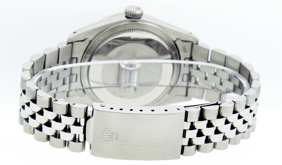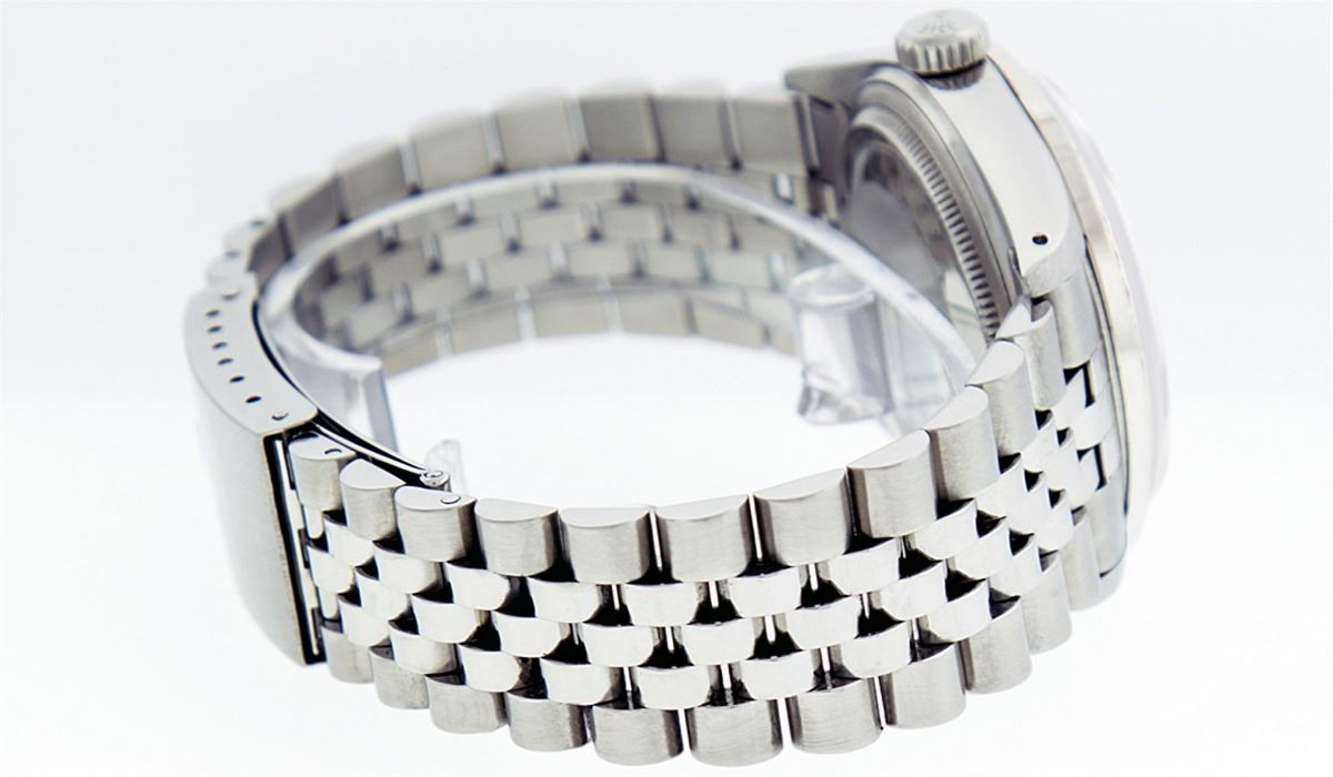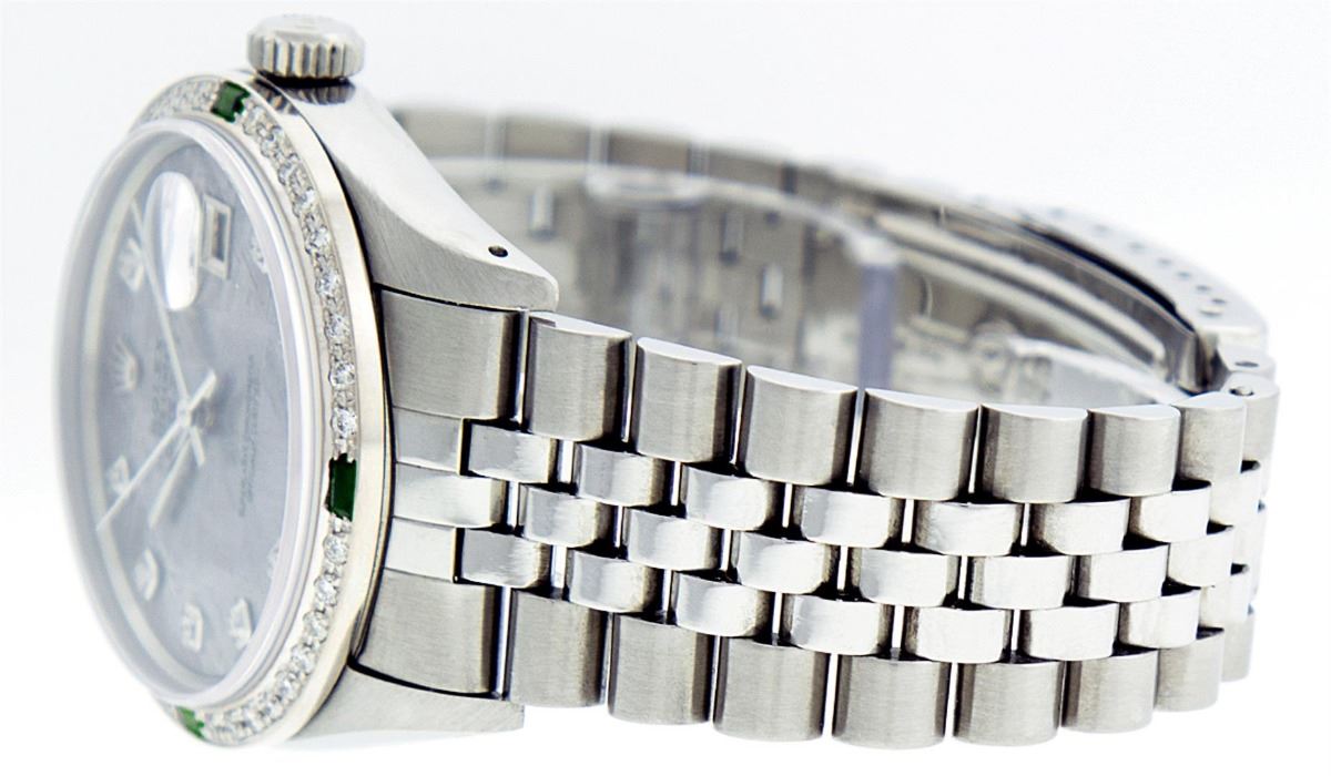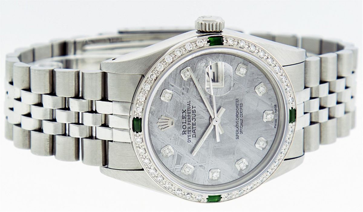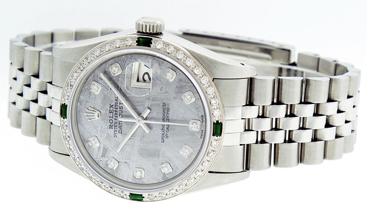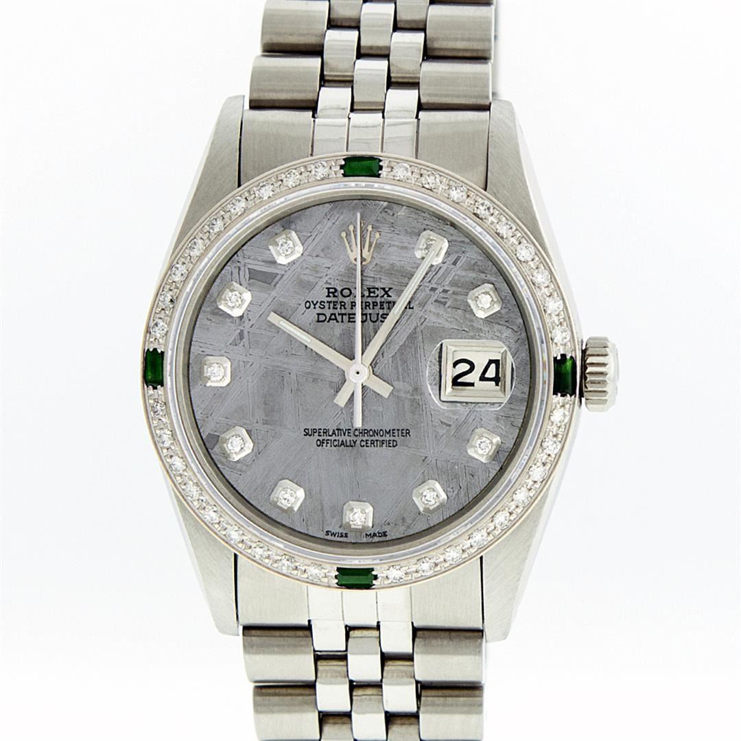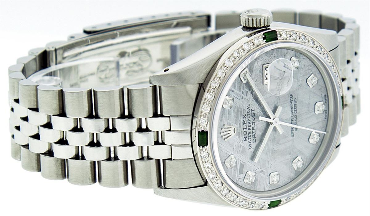 One Gents Stainless Steel Rolex Datejust Polished Bright with Satin Finish, Fully Serviced & Electronically Tested, Stainless Steel Case:36mm, Stainless Steel Crown, Custom Bezel: 18K White Gold Emerald Beadset Diamond Bezel, Diamond Count: 36 Diamonds + 4 Emeralds, Total Weight 1.00 Carat, Clarity: SI-VS, Color: G to H. Custom Crystal: Synthetic Sapphire Cyclops Lens. Movement: Automatic Winding Movement Caliber 3035. Custom Dial: Meteorite Diamond Dial, 10 Diamonds in Dial, G To H In Color, Clarity: SI-VS. Date Window: 3 O'Clock Position Date Display, Quickset, Model: Datejust, Condition: G-6 Extra Fine. Bracelet: Stainless Steel Jubilee. Bright Polish & Satin Finish. 7.0 Inch Length, Adjustable. Standard Clasp, With Rolex Logo. Comes with a 6 month warranty card.