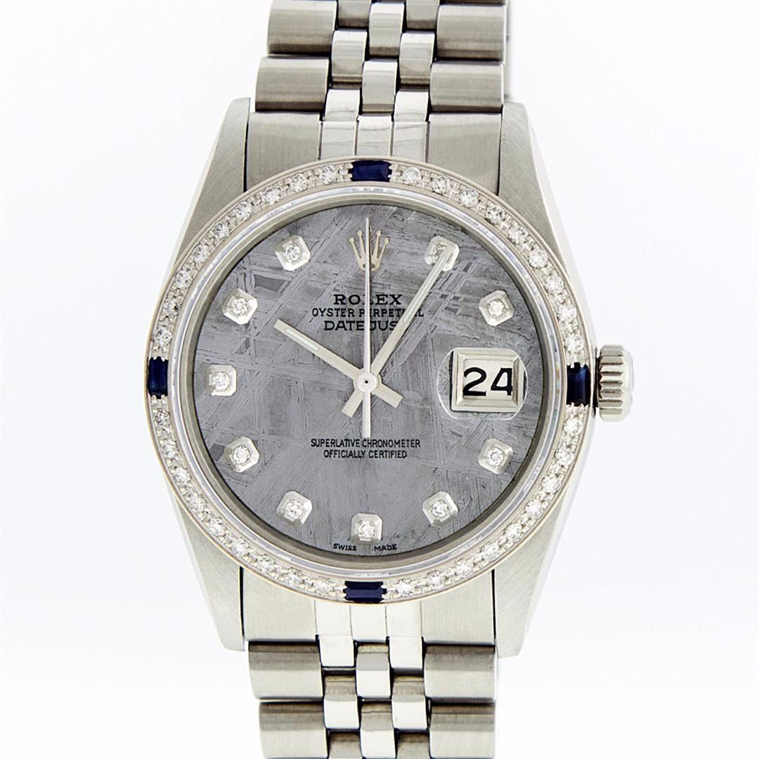 One Gents Stainless Steel Rolex Datejust Polished Bright with Satin Finish, Fully Serviced & Electronically Tested, Stainless Steel Case:36mm, Stainless Steel Crown, Custom Bezel: 18K White Gold Sapphire Beadset Diamond Bezel, Diamond Count: 36 Diamonds + 4 Sapphire, Total Weight 1.00 Carat, Clarity: SI-VS, Color: G to H. Custom Crystal: Synthetic Sapphire Cyclops Lens. Movement: Automatic Winding Movement Caliber 3035. Custom Dial: Meteorite Diamond Dial, 10 Diamonds in Dial, G To H In Color, Clarity: SI-VS. Date Window: 3 O'Clock Position Date Display, Quickset, Model: Datejust, Condition: G-6 Extra Fine. Bracelet: Stainless Steel Jubilee. Bright Polish & Satin Finish. 6.5 Inch Length, Adjustable. Standard Clasp, With Rolex Logo. Comes with a 6 month warranty card.