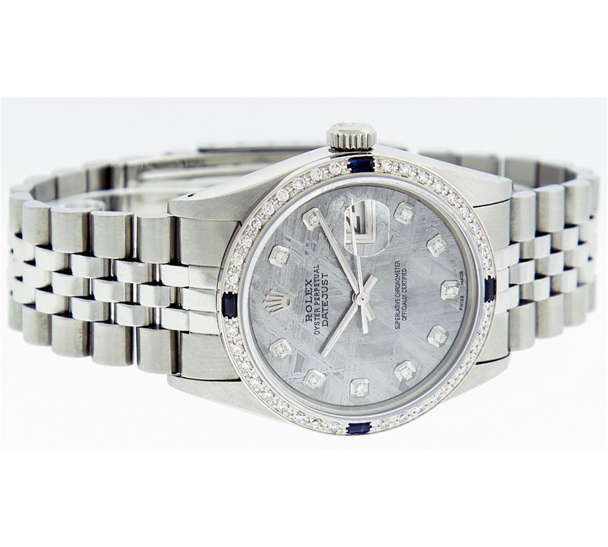 One Gents Stainless Steel Rolex Datejust Polished Bright with Satin Finish, Fully Serviced & Electronically Tested, Stainless Steel Case:36mm, Stainless Steel Crown, Custom Bezel: 18K White Gold Sapphire Beadset Diamond Bezel, Diamond Count: 36 Diamonds + 4 Sapphire, Total Weight 1.00 Carat, Clarity: SI-VS, Color: G to H. Custom Crystal: Synthetic Sapphire Cyclops Lens. Movement: Automatic Winding Movement Caliber 3035. Custom Dial: Meteorite Diamond Dial, 10 Diamonds in Dial, G To H In Color, Clarity: SI-VS. Date Window: 3 O'Clock Position Date Display, Quickset, Model: Datejust, Condition: G-6 Extra Fine. Bracelet: Stainless Steel Jubilee. Bright Polish & Satin Finish. 6.5 Inch Length, Adjustable. Standard Clasp, With Rolex Logo. Comes with a 6 month warranty card.