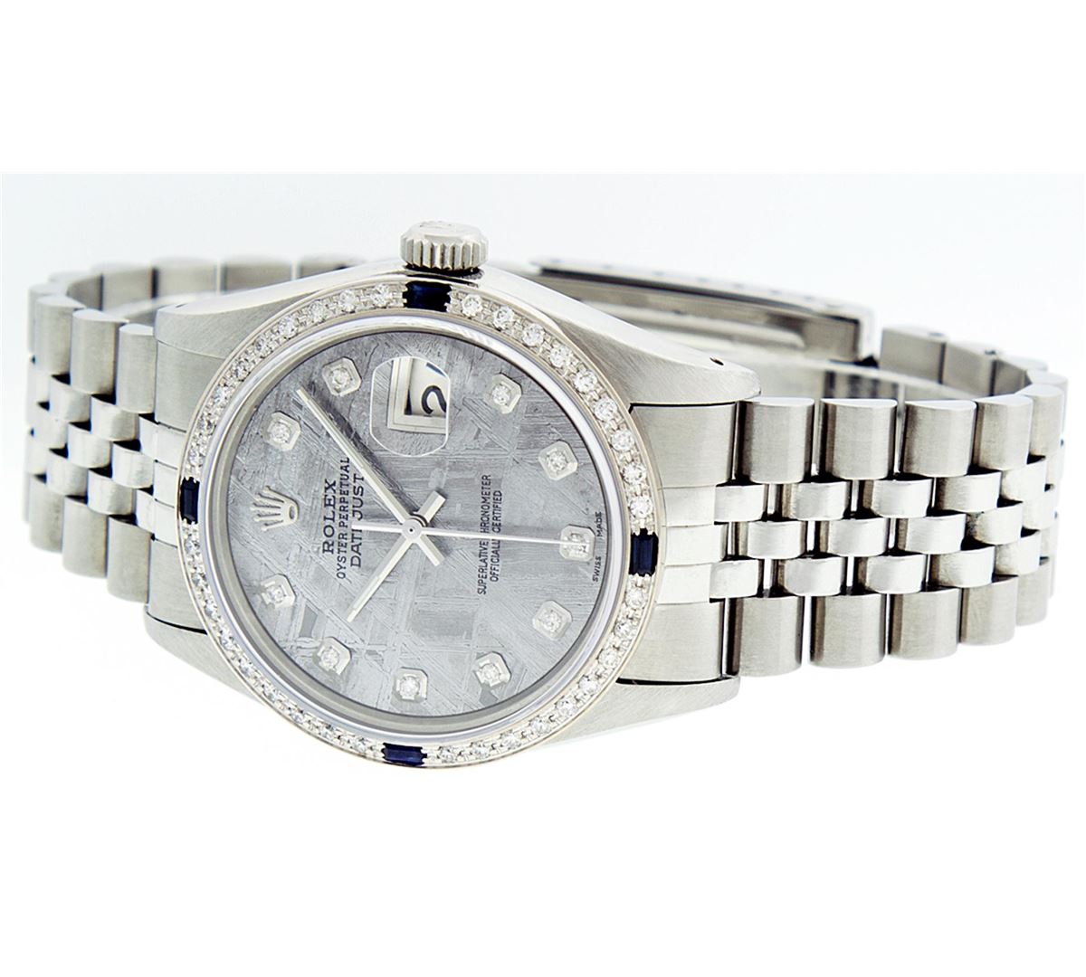 One Gents Stainless Steel Rolex Datejust Polished Bright with Satin Finish, Fully Serviced & Electronically Tested, Stainless Steel Case:36mm, Stainless Steel Crown, Custom Bezel: 18K White Gold Sapphire Beadset Diamond Bezel, Diamond Count: 36 Diamonds + 4 Sapphire, Total Weight 1.00 Carat, Clarity: SI-VS, Color: G to H. Custom Crystal: Synthetic Sapphire Cyclops Lens. Movement: Automatic Winding Movement Caliber 3035. Custom Dial: Meteorite Diamond Dial, 10 Diamonds in Dial, G To H In Color, Clarity: SI-VS. Date Window: 3 O'Clock Position Date Display, Quickset, Model: Datejust, Condition: G-6 Extra Fine. Bracelet: Stainless Steel Jubilee. Bright Polish & Satin Finish. 6.5 Inch Length, Adjustable. Standard Clasp, With Rolex Logo. Comes with a 6 month warranty card.