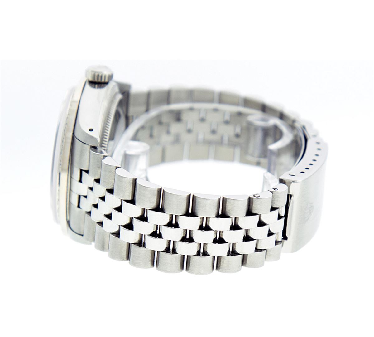 One Gents Stainless Steel Rolex Datejust Polished Bright with Satin Finish, Fully Serviced & Electronically Tested, Stainless Steel Case:36mm, Stainless Steel Crown, Custom Bezel: 18K White Gold Sapphire Beadset Diamond Bezel, Diamond Count: 36 Diamonds + 4 Sapphire, Total Weight 1.00 Carat, Clarity: SI-VS, Color: G to H. Custom Crystal: Synthetic Sapphire Cyclops Lens. Movement: Automatic Winding Movement Caliber 3035. Custom Dial: Meteorite Diamond Dial, 10 Diamonds in Dial, G To H In Color, Clarity: SI-VS. Date Window: 3 O'Clock Position Date Display, Quickset, Model: Datejust, Condition: G-6 Extra Fine. Bracelet: Stainless Steel Jubilee. Bright Polish & Satin Finish. 6.5 Inch Length, Adjustable. Standard Clasp, With Rolex Logo. Comes with a 6 month warranty card.