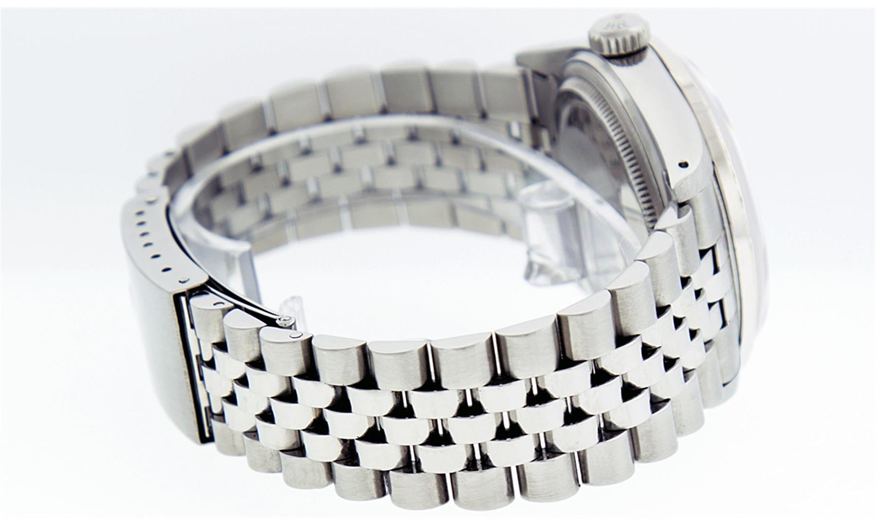 One Gents Stainless Steel Rolex Datejust Polished Bright with Satin Finish, Fully Serviced & Electronically Tested, Stainless Steel Case:36mm, Stainless Steel Crown, Custom Bezel: 18K White Gold Sapphire Beadset Diamond Bezel, Diamond Count: 36 Diamonds + 4 Sapphire, Total Weight 1.00 Carat, Clarity: SI-VS, Color: G to H. Custom Crystal: Synthetic Sapphire Cyclops Lens. Movement: Automatic Winding Movement Caliber 3035. Custom Dial: Meteorite Diamond Dial, 10 Diamonds in Dial, G To H In Color, Clarity: SI-VS. Date Window: 3 O'Clock Position Date Display, Quickset, Model: Datejust, Condition: G-6 Extra Fine. Bracelet: Stainless Steel Jubilee. Bright Polish & Satin Finish. 6.5 Inch Length, Adjustable. Standard Clasp, With Rolex Logo. Comes with a 6 month warranty card.