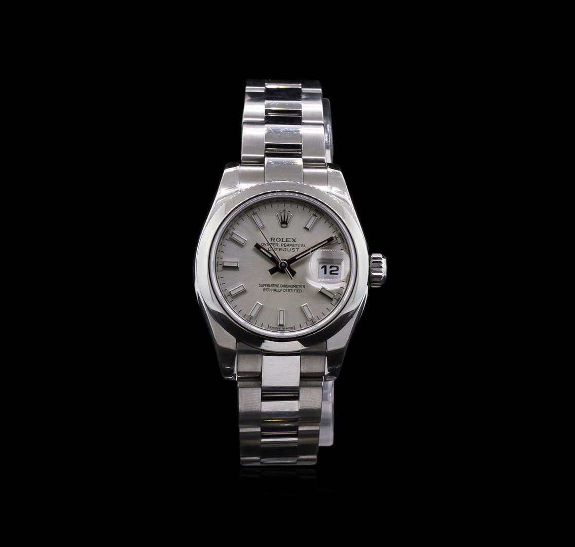One ladies, hand crafted & machine milled Rolex DateJust Model stainless steel wristwatch. Case: Stainless steel. Crown: twinlock with logo, Bezel: polished finish, Crystal: acrylic cyclops lens. Movement: superlative chronometer, Dial: Silvered, with baton hands & indices, Calendar: 3 o'clock position date display. Bracelet: Stainless steel. Excellent like new condition! Comes with box & papers.