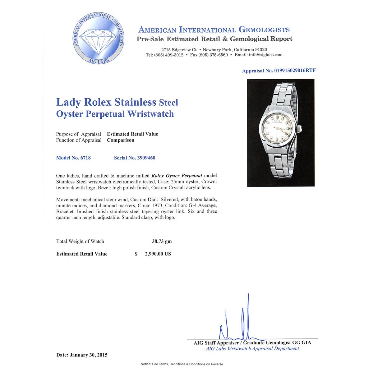 One ladies, hand crafted & machine milled Rolex Oyster Perpetual model Stainless Steel wristwatch electronically tested, Case: 25mm oyster, Crown: twinlock with logo, Bezel: high polish finish, Custom Crystal: acrylic lens. Movement: mechanical stem wind, Custom Dial: Silvered, with baton hands, minute indices, and diamond markers, Circa: 1973, Condition: G-4 Average, Bracelet: brushed finish stainless steel tapering oyster link. Six and three quarter inch length, adjustable. Standard clasp, with logo. Total Weight of Watch 38.73 grams. AIG Appraised at $2,990.00.