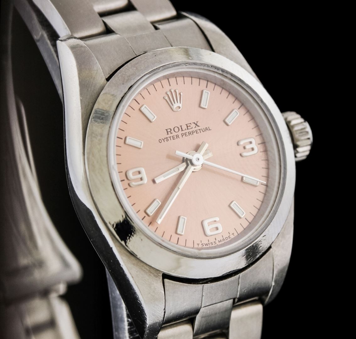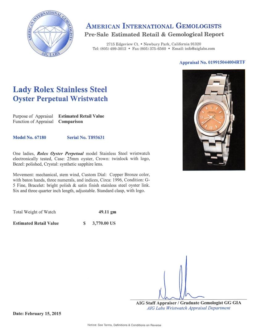 One ladies, Rolex Oyster Perpetual model Stainless Steel wristwatch electronically tested, Case: 25mm oyster, Crown: twinlock with logo, Bezel: polished, Crystal: synthetic sapphire lens. Movement: mechanical, stem wind, Custom Dial: Copper Bronze color, with baton hands, three numerals, and indices, Circa: 1996, Condition: G-5 Fine, Bracelet: bright polish & satin finish stainless steel oyster link. Six and three quarter inch length, adjustable. Standard clasp, with logo. Total Weight of Watch 49.11 grams. AIG Appraised at $3,770.00.