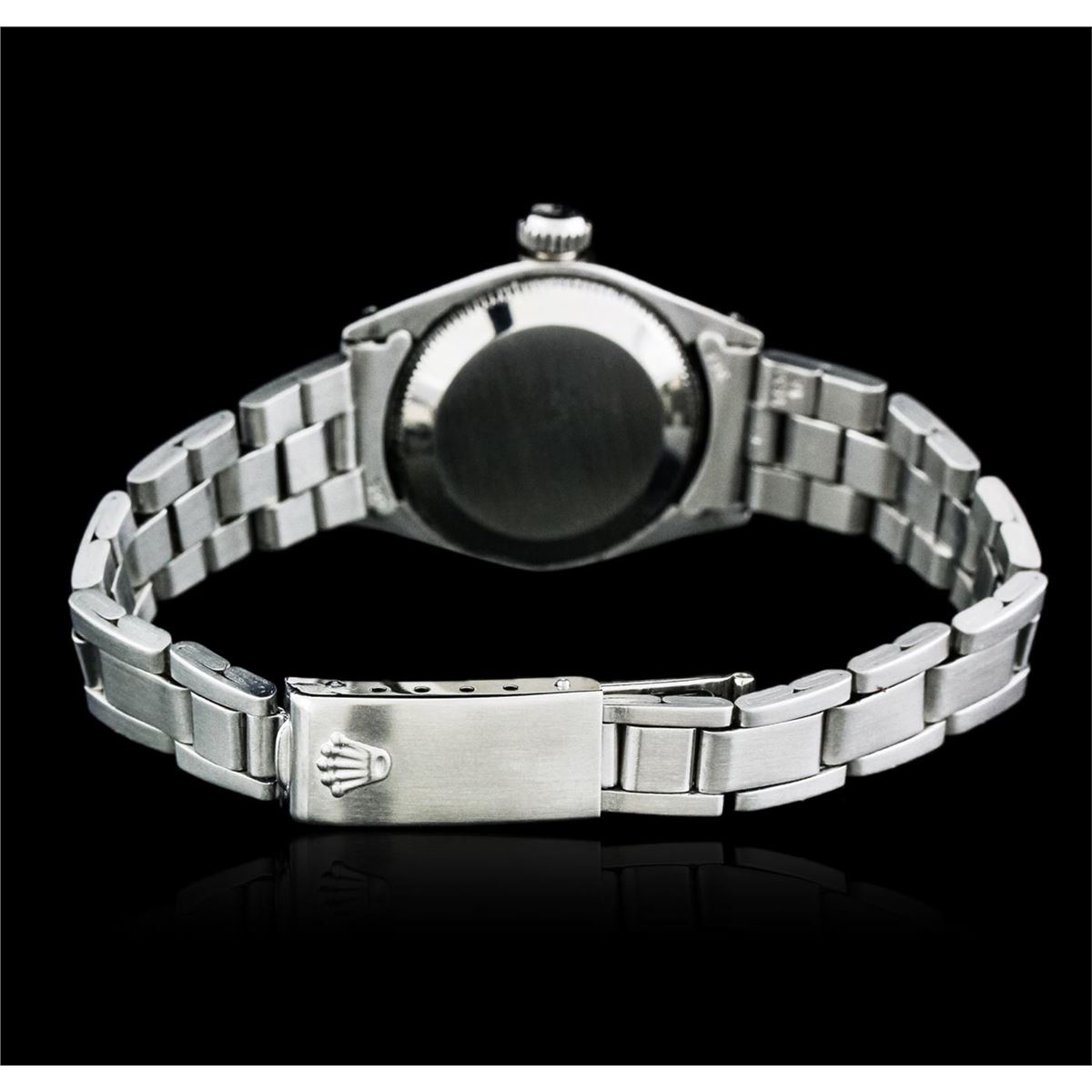 One ladies, hand crafted & machine milled Rolex Oyster Perpetual model Stainless Steel wristwatch electronically tested, Case: 25mm oyster, Crown: twinlock with logo, Bezel: high polish finish, Custom Crystal: acrylic lens. Movement: mechanical stem wind, Custom Dial: Silvered, with baton hands, minute indices, and diamond markers, Circa: 1973, Condition: G-4 Average, Bracelet: brushed finish stainless steel tapering oyster link. Six and three quarter inch length, adjustable. Standard clasp, with logo. Total Weight of Watch 38.73 grams. AIG Appraised at $2,990.00.