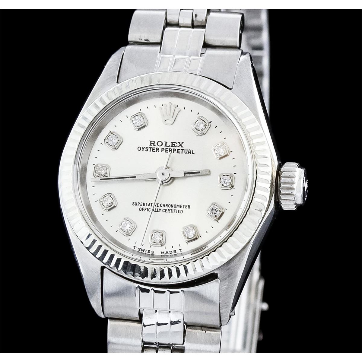 One ladies, hand crafted & machine milled Rolex Oyster Perpetual model Stainless Steel wristwatch electronically tested, Case: 25mm oyster, Crown: twinlock with logo, Bezel: fluted, Custom Crystal: acrylic lens. Movement: superlative chronometer, Custom Dial: Silvered, with baton hands, minute indices, and diamond markers, Circa: 1966, Condition: G-4 Average, Bracelet: bright polish & brushed finish stainless steel Jubilee link. Seven inch length, adjustable. Standard clasp, with logo. Total Weight of Watch 40.20 grams. AIG Appraised at $3,050.00.