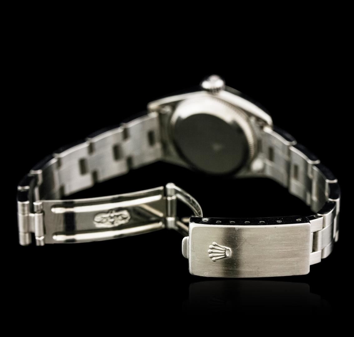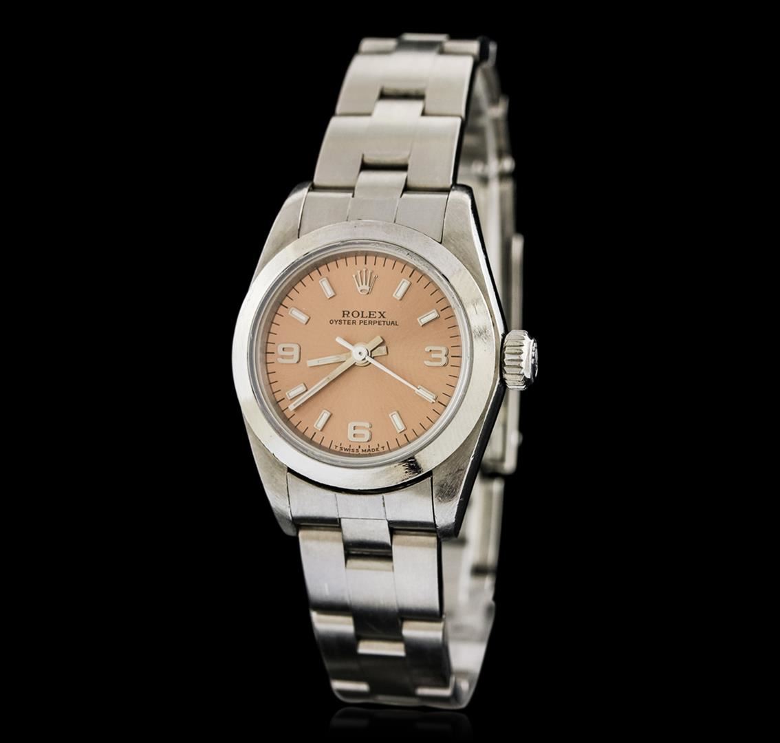 One ladies, Rolex Oyster Perpetual model Stainless Steel wristwatch electronically tested, Case: 25mm oyster, Crown: twinlock with logo, Bezel: polished, Crystal: synthetic sapphire lens. Movement: mechanical, stem wind, Custom Dial: Copper Bronze color, with baton hands, three numerals, and indices, Circa: 1996, Condition: G-5 Fine, Bracelet: bright polish & satin finish stainless steel oyster link. Six and three quarter inch length, adjustable. Standard clasp, with logo. Total Weight of Watch 49.11 grams. AIG Appraised at $3,770.00.