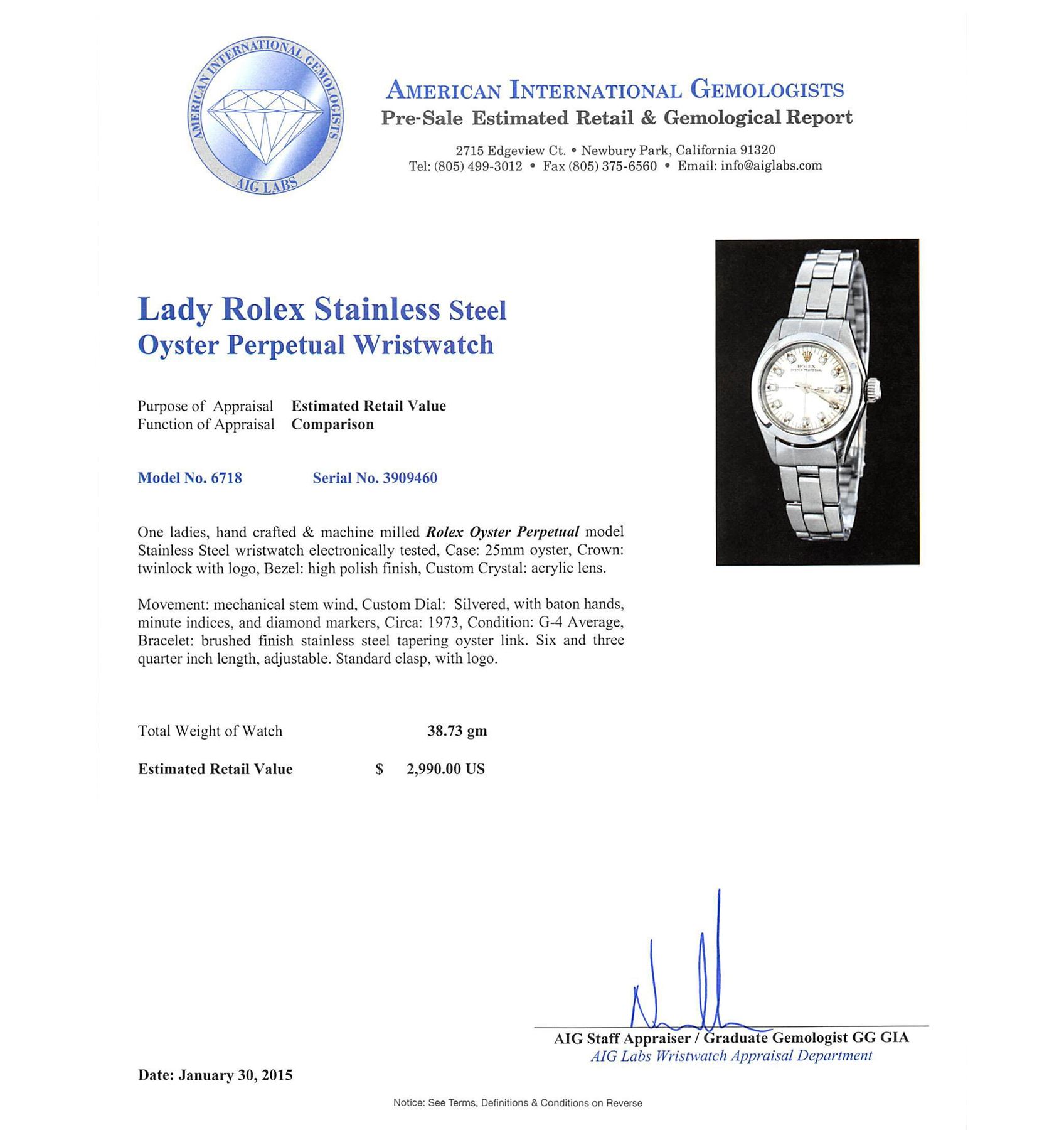 One ladies, hand crafted & machine milled Rolex Oyster Perpetual model Stainless Steel wristwatch electronically tested, Case: 25mm oyster, Crown: twinlock with logo, Bezel: high polish finish, Custom Crystal: acrylic lens. Movement: mechanical stem wind, Custom Dial: Silvered, with baton hands, minute indices, and diamond markers, Circa: 1973, Condition: G-4 Average, Bracelet: brushed finish stainless steel tapering oyster link. Six and three quarter inch length, adjustable. Standard clasp, with logo. Total Weight of Watch 38.73 grams. AIG Appraised at $2,990.00.
