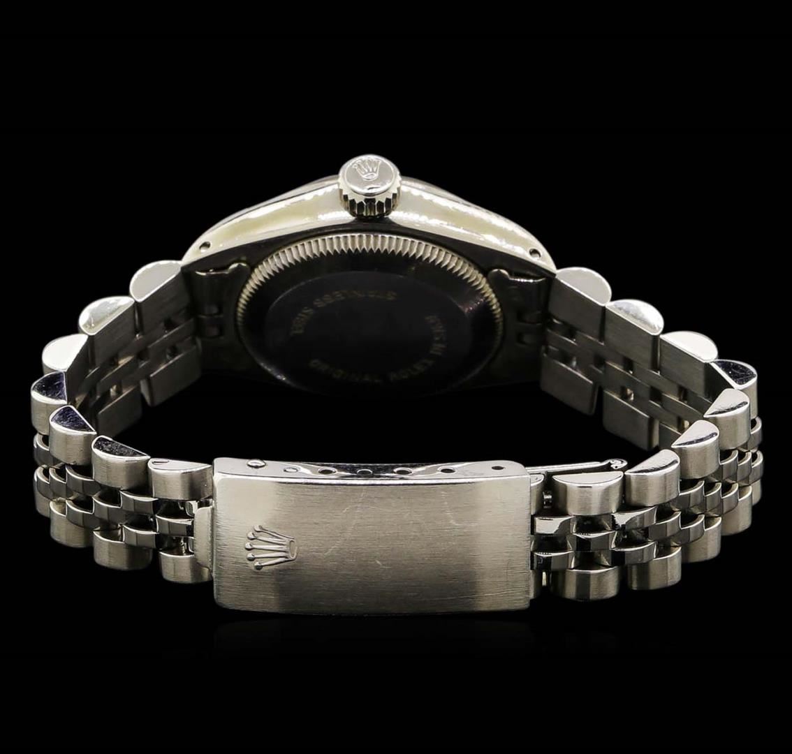 One ladies, vintage Rolex Oyster Perpetual model Stainless Steel wristwatch electronically tested, Case: 25mm oyster, Crown: twinlock with logo, Bezel: polished, Custom Crystal: acrylic lens. Movement: mechanical, stem wind, Dial: Gray, with baton hands and indices, Circa: 1982, Condition: G-5 Fine, Bracelet: bright polish & satin finish stainless steel jubilee link. Five and three quarter inch length, adjustable. Standard clasp, with logo. Total Weight of Watch 42.86 grams. AIG Appraised at $2,880.00.