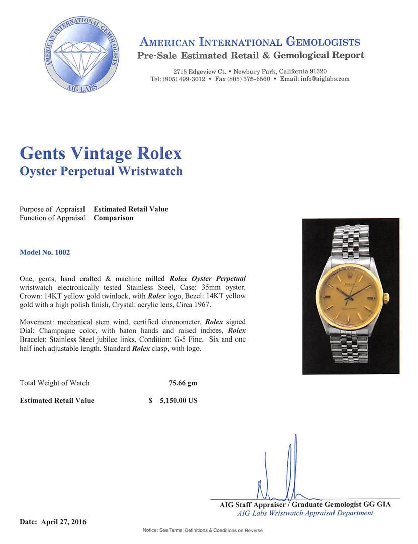 One, gents, hand crafted & machine milled Rolex Oyster Perpetual wristwatch electronically tested Stainless Steel, Case: 35mm oyster, Crown: 14KT yellow gold twinlock, with Rolex logo, Bezel: 14KT yellow gold with a high polish finish, Crystal: acrylic lens, Circa 1967.Movement: mechanical stem wind, certified chronometer, Rolex signed Dial: Champagne color, with baton hands and raised indices, Rolex Bracelet: Stainless Steel jubilee links, Condition: G-5 Fine. Six and one half inch adjustable length. Standard Rolex clasp, with logo. Total Weight of Watch 75.66gm. AIG Appraised at $5,150.00.