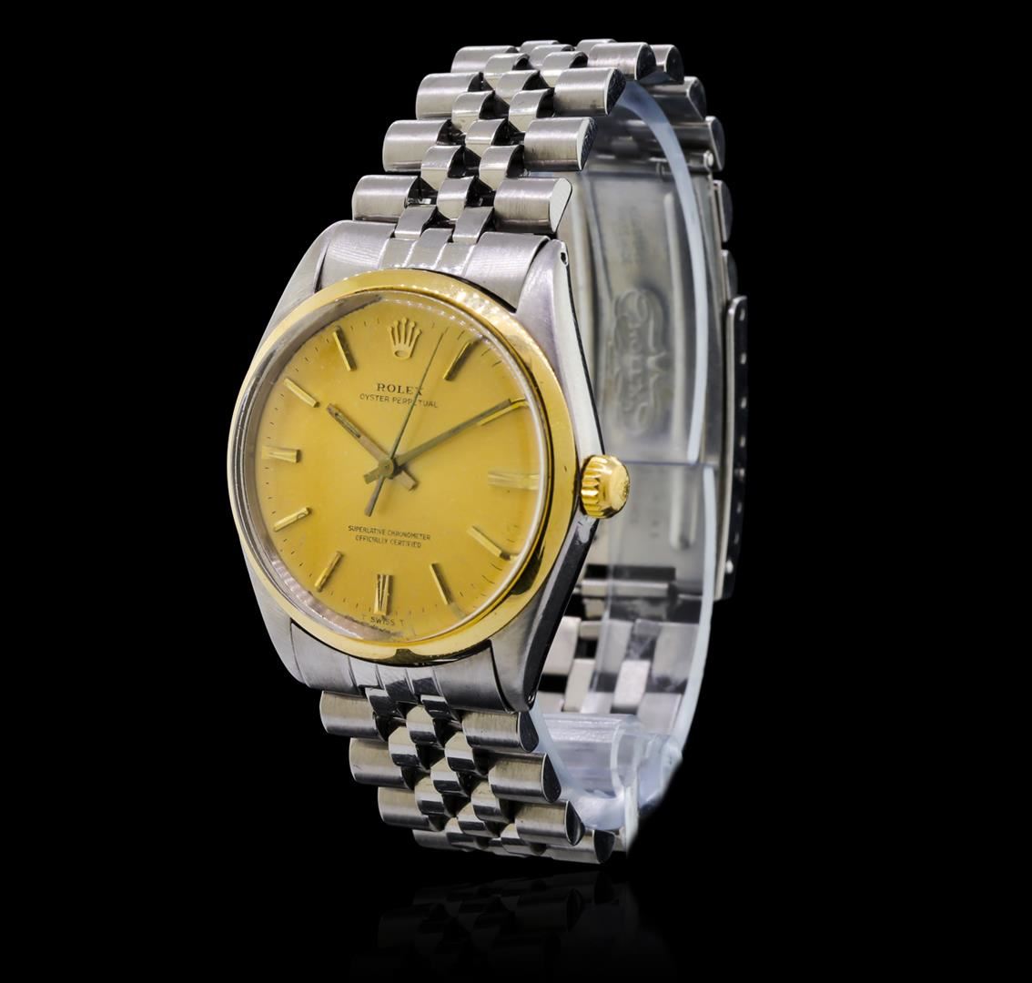 One, gents, hand crafted & machine milled Rolex Oyster Perpetual wristwatch electronically tested Stainless Steel, Case: 35mm oyster, Crown: 14KT yellow gold twinlock, with Rolex logo, Bezel: 14KT yellow gold with a high polish finish, Crystal: acrylic lens, Circa 1967.Movement: mechanical stem wind, certified chronometer, Rolex signed Dial: Champagne color, with baton hands and raised indices, Rolex Bracelet: Stainless Steel jubilee links, Condition: G-5 Fine. Six and one half inch adjustable length. Standard Rolex clasp, with logo. Total Weight of Watch 75.66gm. AIG Appraised at $5,150.00.