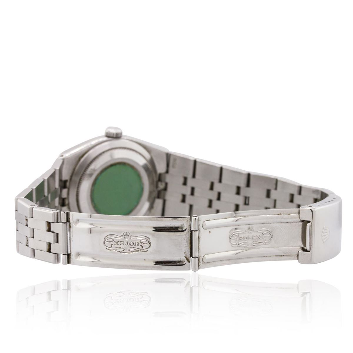 One gents, hand crafted & machine milled Rolex OysterQuartz DateJust wristwatch electronically tested Stainless Steel, Case: 36mm OysterQuartz, Crown: twinlock with logo, Bezel: fluted, Crystal: synthetic sapphire cyclops lens. Movement: Swiss quartz chronometer, Dial: Slate color, with baton hands and diamond markers, Date Window: 3 o'clock position, quick set, Bracelet: Stainless Steel OysterQuartz, Condition: G-5 Fine. Bright polish and brushed finish. Eight inch length, adjustable. Circa: 1992. Total Weight of Watch 123.98 grams. AIG Appraised at $4,240.00.