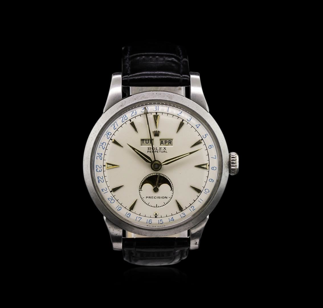 The featured watch was specifically highlighted on page 183 in the June 11, 2015 issue of Sotheby's Important Watches catalogue. One Rolex Padellone circa 1950. The featured watch is a fine stainless steel automatic triple calendar wristwatch with moon phases. Reference # 8171. Case # 902479. Movement # 37263. Case Diameter of 38mm. 10.5 inches automatic nickel finished lever 18 jewel movement. Crystal: Acrylic dome. Silvered dial, applied faceted dart indexes. Apertures for day and month, subsidiary dial for seconds, combined with moon phases. Outer minute track, outer blue date with arrow hand. Stainless steel case with snap-on case back. Case, dial and movement signed. Band: Sotheby's leather band (also ships with authentic Rolex leather band). GAS Appraised at $45,000.00.