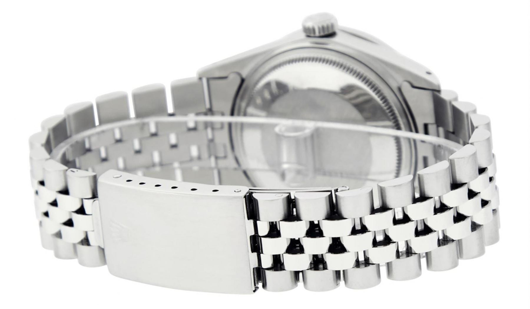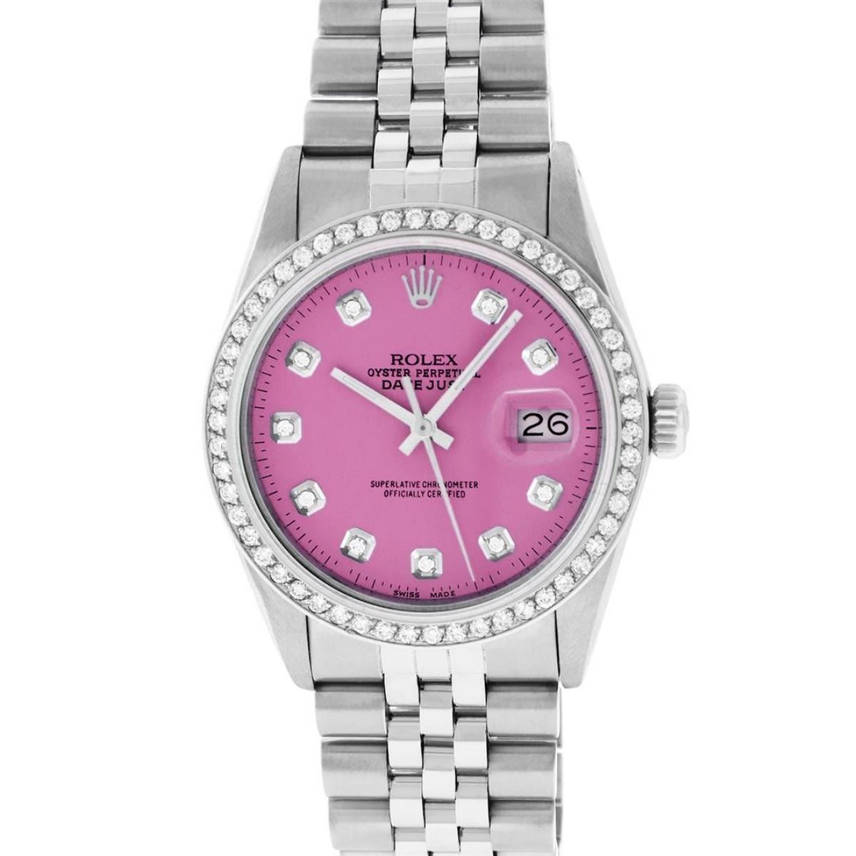 One Mens Rolex Stainless Steel Datejust Polished Bright with Satin Finish, This Watch Has Been Serviced & Electronically Tested, Stainless Steel Case: 36mm, Stainless Steel Crown, Custom Bezel: New Stainless Steel Beadset Diamond Bezel, Diamond Count: 54 Diamonds In Bezel, Total Weight 1.00 Carat, Clarity: SI-VS, Color: G to H. Custom Crystal: New Scratch Resistant Synthetic Sapphire Cyclops Lens. Custom Hands: New Luminescent Hands. Movement: Automatic Winding Movement. Custom Dial: Pink Diamond Dial With Dash Track, Diamond Count: 10 Diamonds On Dial, Color: G to H, Clarity: VS2-SI1. Date Window: 3 O'Clock Position Date Display, Quickset, Model: Datejust. Condition: G-6 Extra Fine. Bracelet: Stainless Steel Jubilee Band. Bright Polish & Satin Finish. 7.0 Inch Length, Adjustable. Standard Clasp, With Rolex Logo. This Watch Has Been Serviced Time Tested And Is In Excellent Condition It Is Free Of All Scratches And Dents.