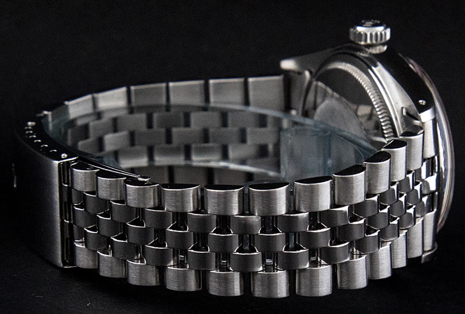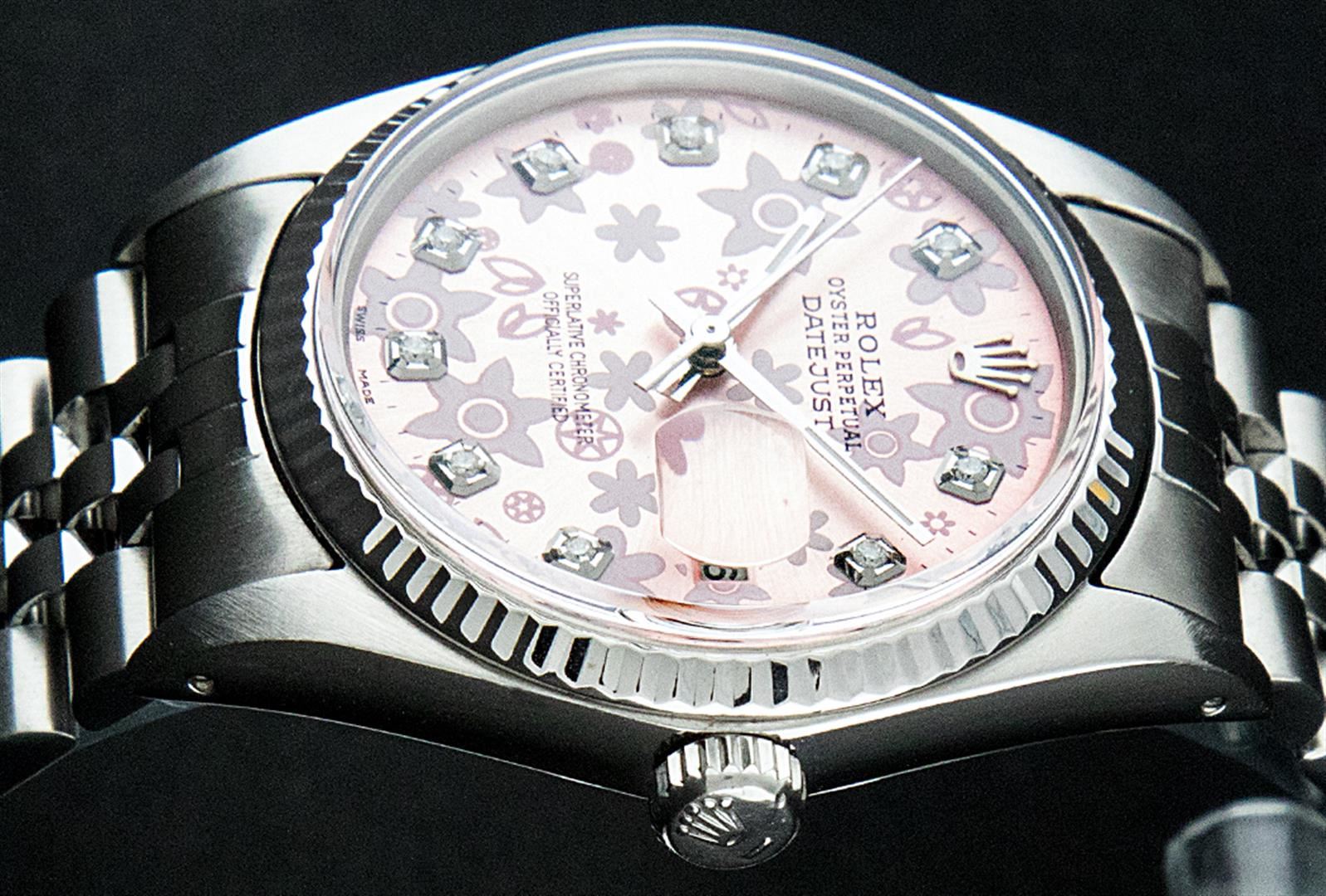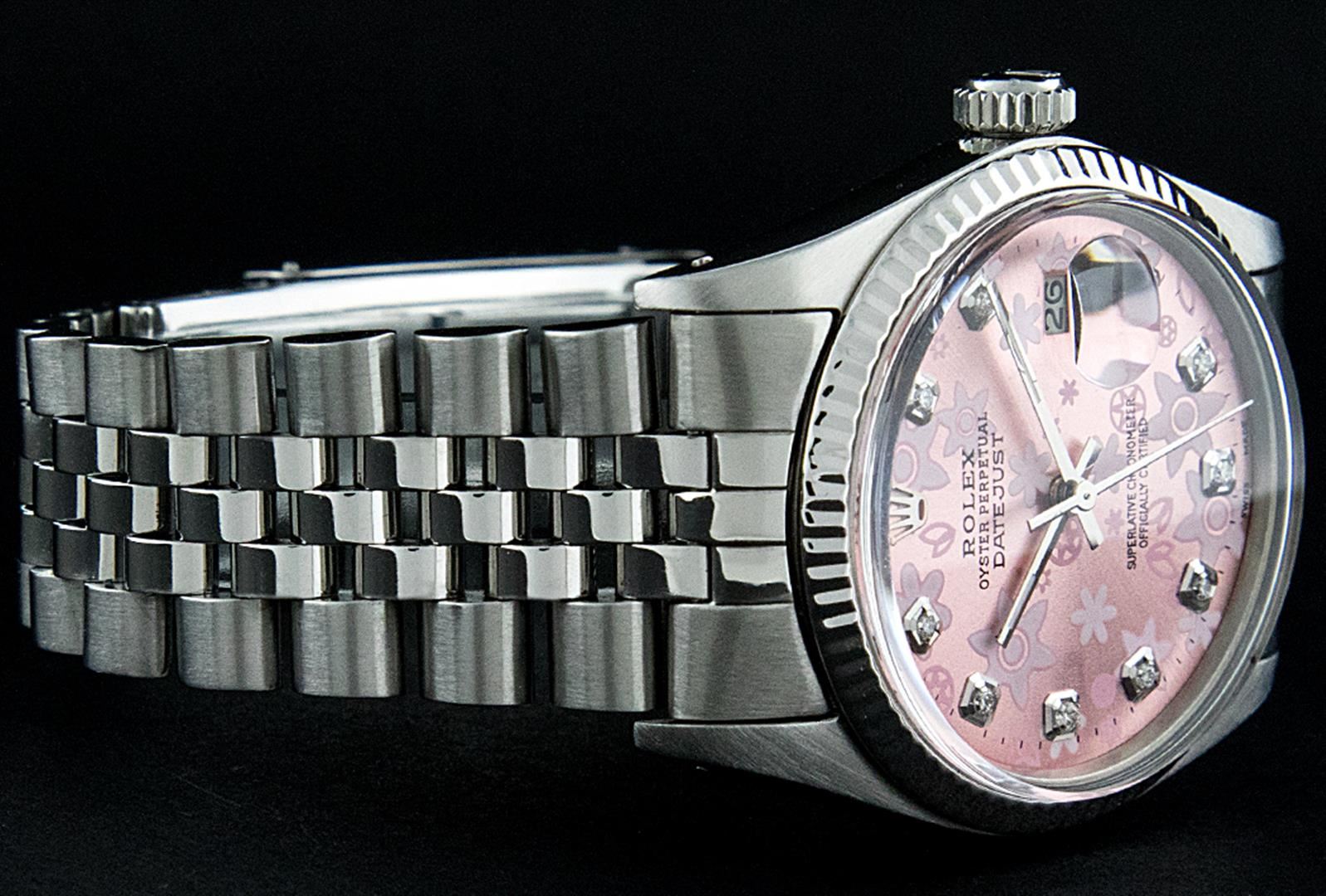 One Gents Rolex Datejust Polished, Serviced & Electronically Tested, Stainless Steel Case:36mm, Stainless Steel Crown, Bezel: 18K White Gold Fluted Bezel. Custom Crystal: Acrylic Cyclops Lens. Movement: Automatic Winding Movement Caliber 3035. Custom Dial: Pink Floral Dial With Diamond Hour Markers, Diamond Count: 10 Diamonds, Clarity: SI-VS, Color: G To H. Date Window: 3 O'Clock Position Date Display, Quickset, Model: 16014 Condition: G-6 Extra Fine. Bracelet: Stainless Steel Jubilee. Bright Polish & Satin Finish. 7.0 Inch Length, Adjustable. Standard Clasp, With Rolex Logo.