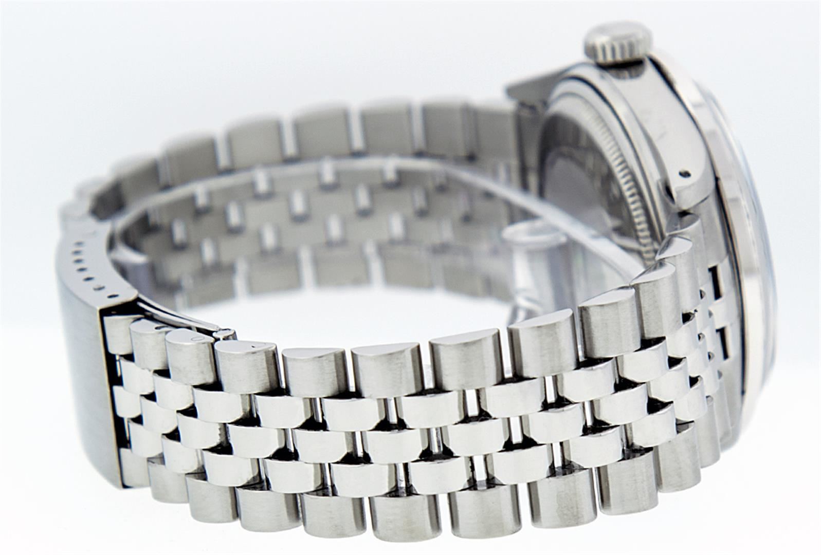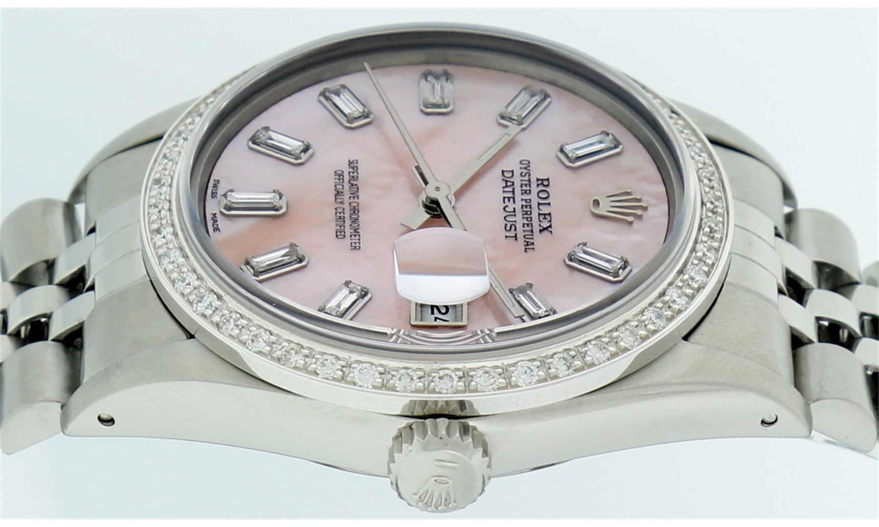 One Gents Rolex Datejust Polished, Serviced & Electronically Tested, Stainless Steel Case:36mm, Stainless Steel Crown, Custom Bezel: 18K White Gold Beadset Diamond Bezel, Diamond Count: 44 Diamonds, Total Weight 1.00 Carat, Clarity: SI-VS, Color: G to H. Custom Crystal: Synthetic Sapphire Cyclops Lens. Movement: Automatic Winding Movement Caliber 3035. Custom Dial: Pink MOP Baguette Diamond Hour Markers, Diamond Count: 10 Diamond Baguette. G To H In Color, Clarity: SI-VS. Date Window: 3 O'Clock Position Date Display, Quickset, Model: Datejust. Condition: G-6 Extra Fine. Bracelet: Stainless Steel Jubilee. Bright Polish & Satin Finish. 7.0 Inch Length, Adjustable. Standard Clasp, With Rolex Logo. Comes with 6 month warranty.