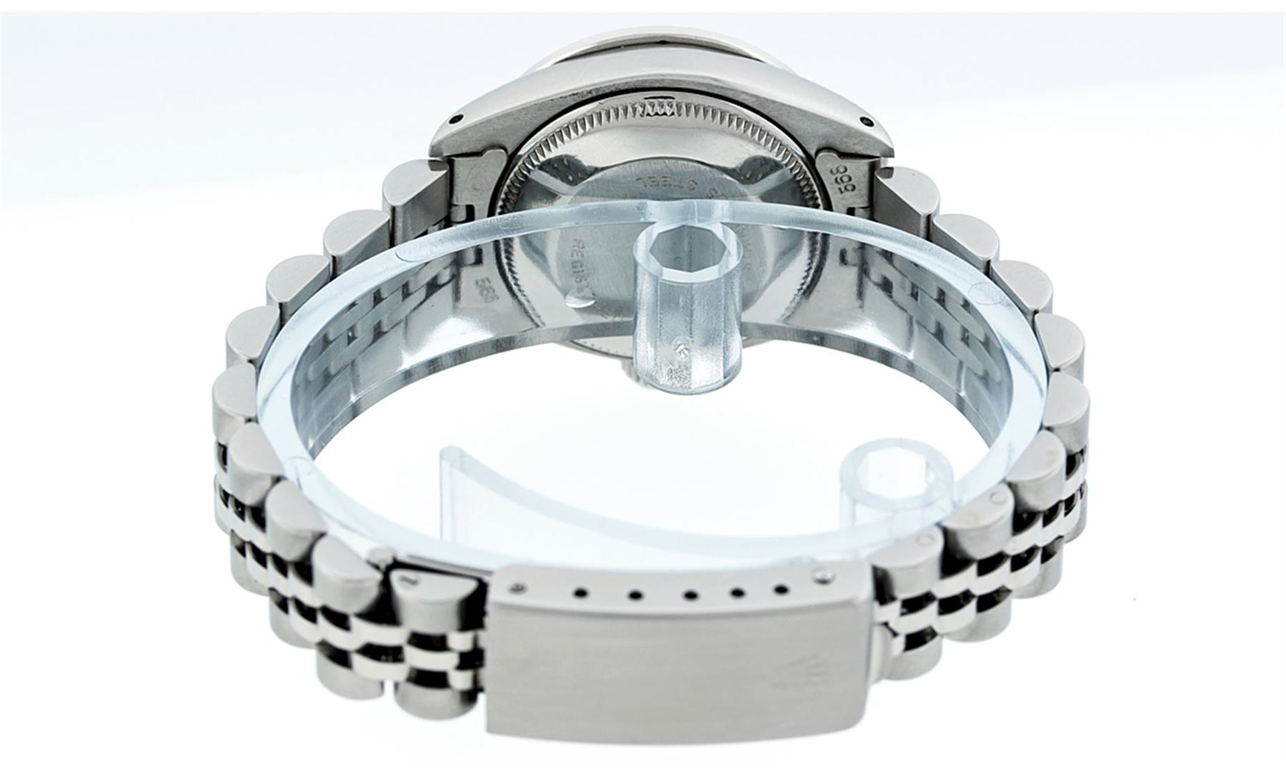 One Ladies Rolex Datejust Polished Bright with Satin Finish, Serviced & Electronically Tested, Stainless Steel Case:26mm, Stainless Steel Crown, Custom Bezel: 18K White Gold Ruby Beadset Diamond Bezel, Diamond Count: 28 Diamonds + 4 Rubies Total Weight .70 Carat, Clarity: SI-VS, Color: G to H. Custom Crystal: Synthetic Sapphire Cyclops Lens. Movement: Automatic Winding Movement Caliber 2030. Custom Dial: Purple Dial with Diamond Hour Markers. Diamond Count: 10 Diamonds In Dial, Clarity: SI-VS, Color: G to H. Date Window: 3 O'Clock Position Date Display, Model: Datejust. Condition: G-6 Extra Fine. Bracelet: Stainless Steel Jubilee Band. Bright Polish & Satin Finish. 6.0 Inch Length, Adjustable. Standard Clasp, With Rolex Logo.