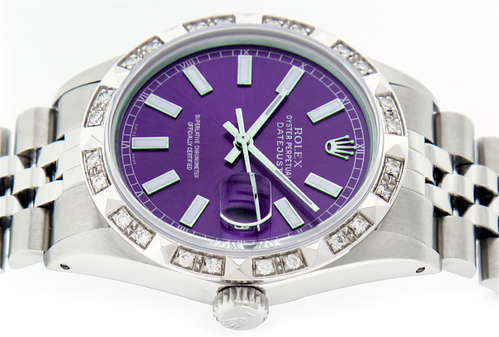 One Mens Rolex Datejust Polished Bright with Satin Finish, Serviced & Electronically Tested, Stainless Steel Case:36mm, Stainless Steel Crown, Custom Bezel: 18K White Gold Pyramid Diamond Bezel, Diamond Count: 24 Diamonds Total Weight .70 Carat, Clarity: SI-VS, Color: G to H. Custom Crystal: Synthetic Sapphire Cyclops Lens. Movement: Automatic Winding Movement Caliber 3035. Custom Dial: Purple Index Dial. Date Window: 3 O'Clock Position Date Display, Quickset, Model: Datejust, Condition: G-6 Extra Fine. Bracelet: Stainless Steel Jubilee. Bright Polish & Satin Finish. 7.0 Inch Length, Adjustable. Standard Clasp, With Rolex Logo. Comes with a 6 month warranty card.