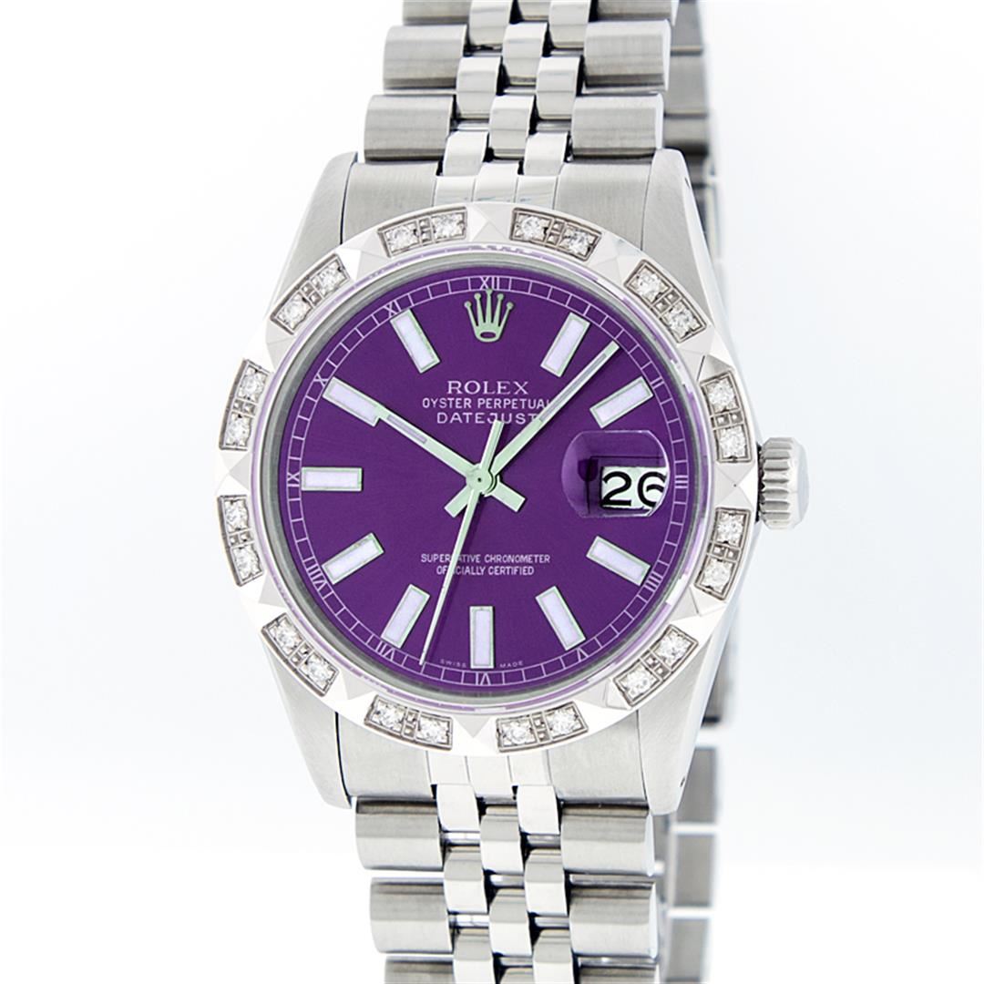 One Mens Rolex Datejust Polished Bright with Satin Finish, Serviced & Electronically Tested, Stainless Steel Case:36mm, Stainless Steel Crown, Custom Bezel: 18K White Gold Pyramid Diamond Bezel, Diamond Count: 24 Diamonds Total Weight .70 Carat, Clarity: SI-VS, Color: G to H. Custom Crystal: Synthetic Sapphire Cyclops Lens. Movement: Automatic Winding Movement Caliber 3035. Custom Dial: Purple Index Dial. Date Window: 3 O'Clock Position Date Display, Quickset, Model: Datejust, Condition: G-6 Extra Fine. Bracelet: Stainless Steel Jubilee. Bright Polish & Satin Finish. 7.0 Inch Length, Adjustable. Standard Clasp, With Rolex Logo. Comes with a 6 month warranty card.