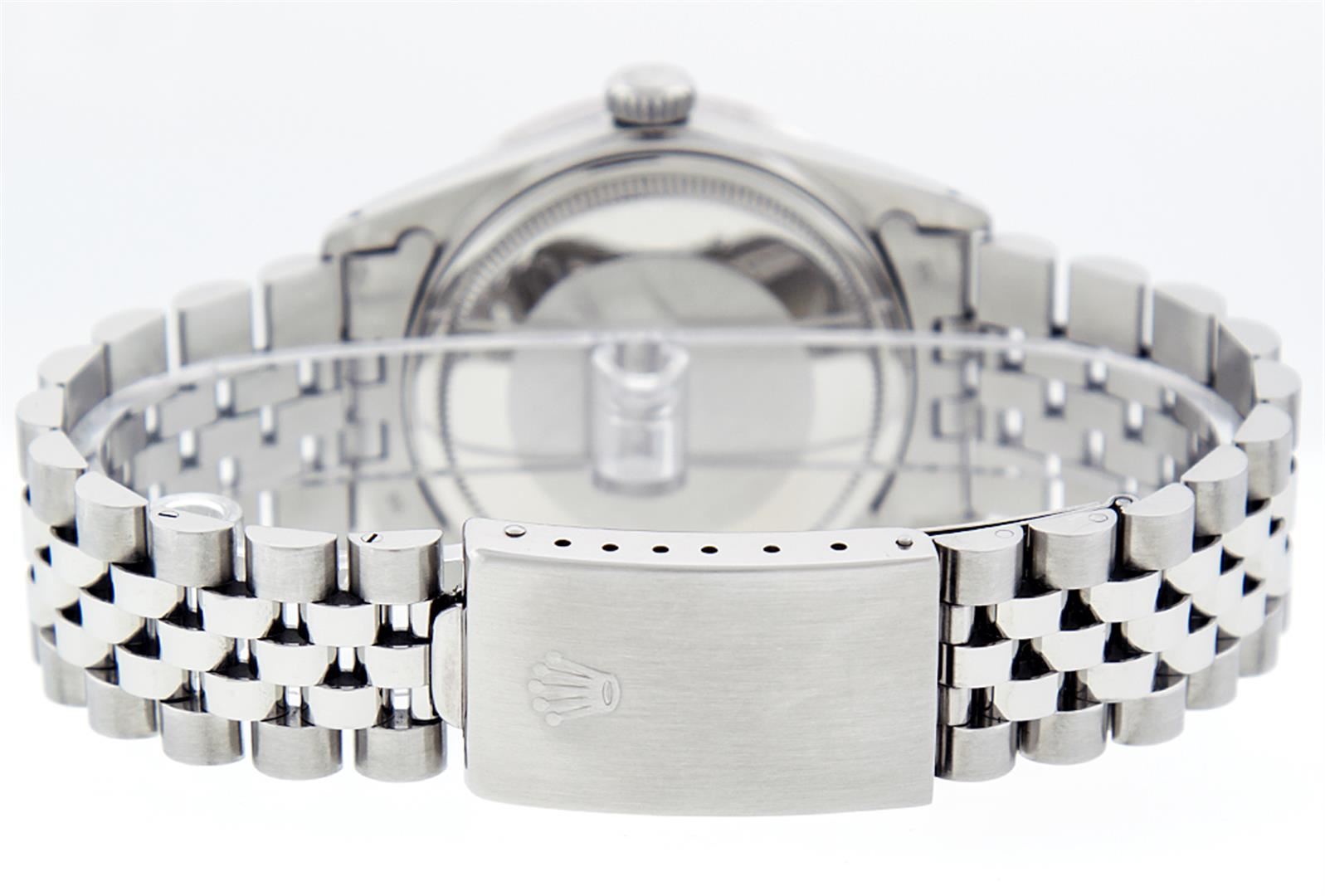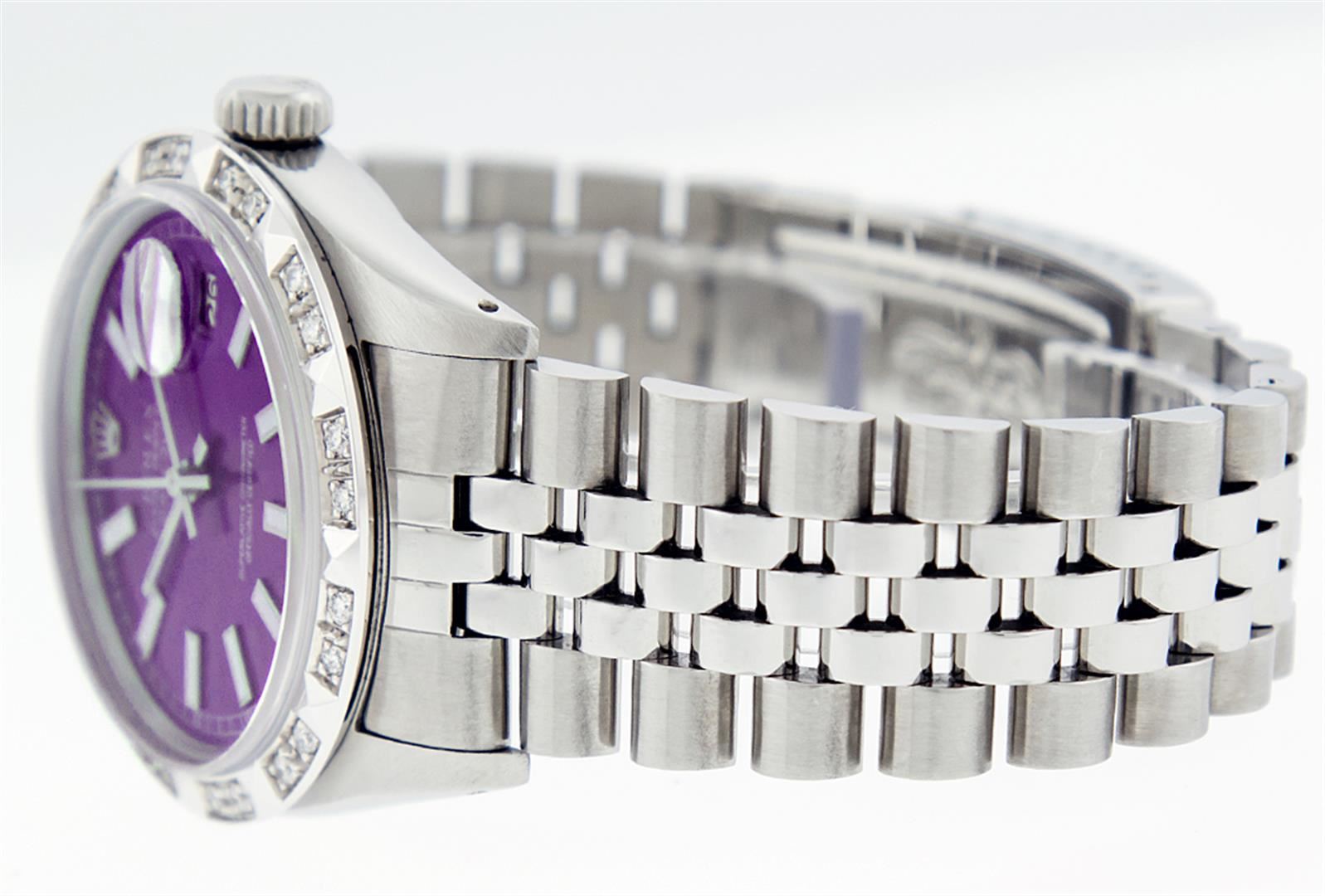 One Mens Rolex Datejust Polished Bright with Satin Finish, Serviced & Electronically Tested, Stainless Steel Case:36mm, Stainless Steel Crown, Custom Bezel: 18K White Gold Pyramid Diamond Bezel, Diamond Count: 24 Diamonds Total Weight .70 Carat, Clarity: SI-VS, Color: G to H. Custom Crystal: Synthetic Sapphire Cyclops Lens. Movement: Automatic Winding Movement Caliber 3035. Custom Dial: Purple Index Dial. Date Window: 3 O'Clock Position Date Display, Quickset, Model: Datejust, Condition: G-6 Extra Fine. Bracelet: Stainless Steel Jubilee. Bright Polish & Satin Finish. 7.0 Inch Length, Adjustable. Standard Clasp, With Rolex Logo. Comes with a 6 month warranty card.