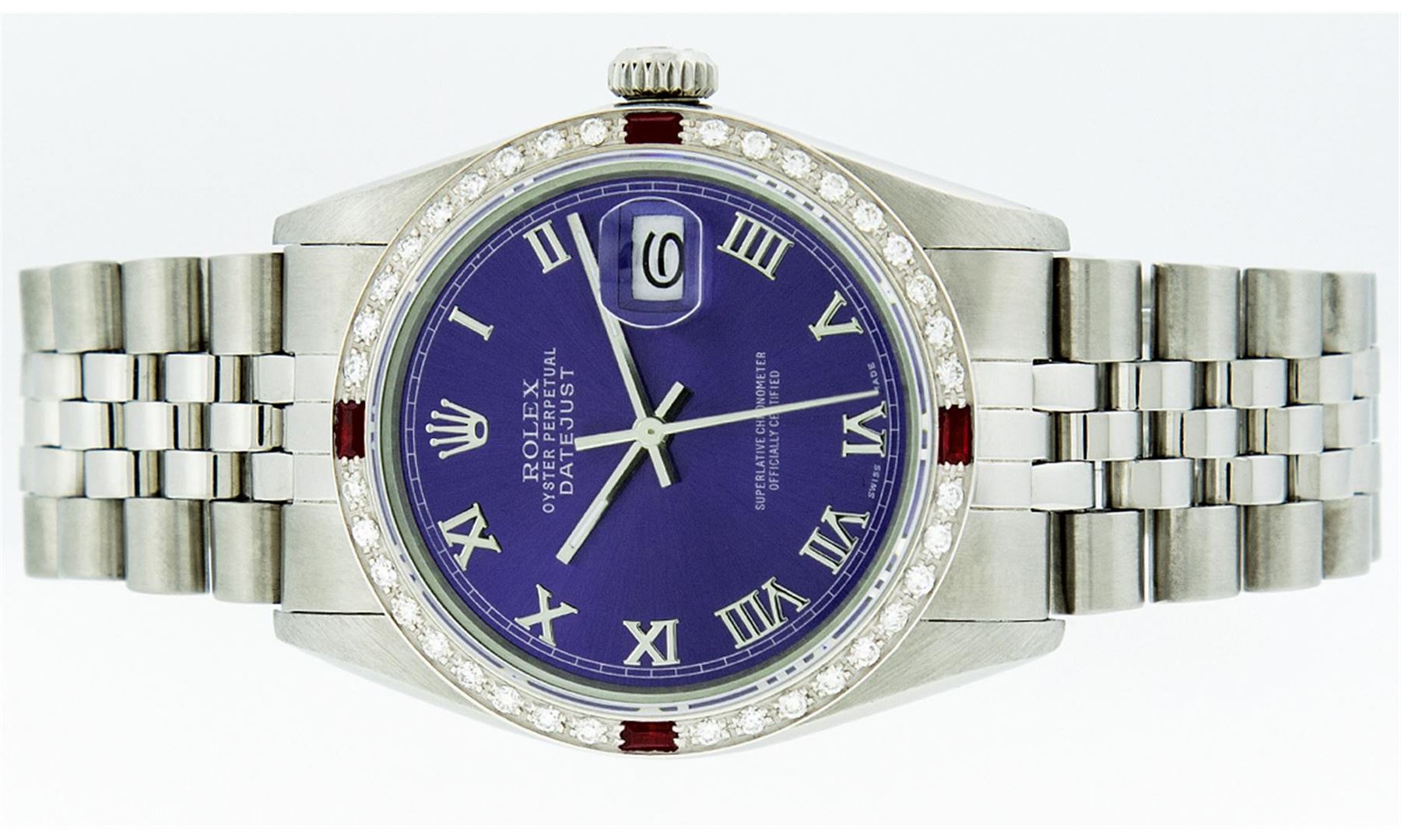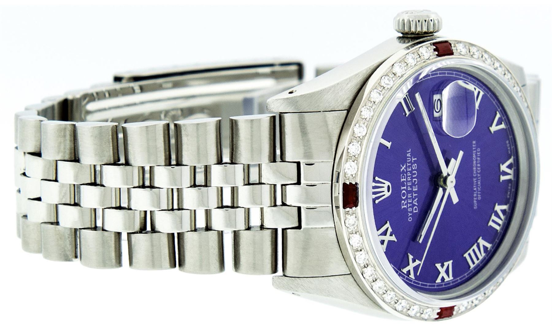 One Mens Rolex Datejust Polished Bright with Satin Finish, Serviced & Electronically Tested, Stainless Steel Case:36mm, Stainless Steel Crown, Custom Bezel: 18K White Gold Ruby Beadset Diamond Bezel, Diamond + Gem Count: 36 Diamonds + 4 Rubies. Total Weight 1.00 Carat, Clarity: Si-VS, Color: G to H. Custom Crystal: Synthetic Sapphire Cyclops Lens. Movement: Automatic Winding Movement Caliber 3035. Custom Dial: Purple Roman Dial With Square Track. Date Window: 3 O'Clock Position Date Display, Quickset, Model: Datejust. Condition: G-6 Extra Fine. Bracelet: Stainless Steel Jubilee. Bright Polish & Satin Finish. 7.0 Inch Length, Adjustable. Standard Clasp, With Rolex Logo. Comes with a 6 month warranty card.