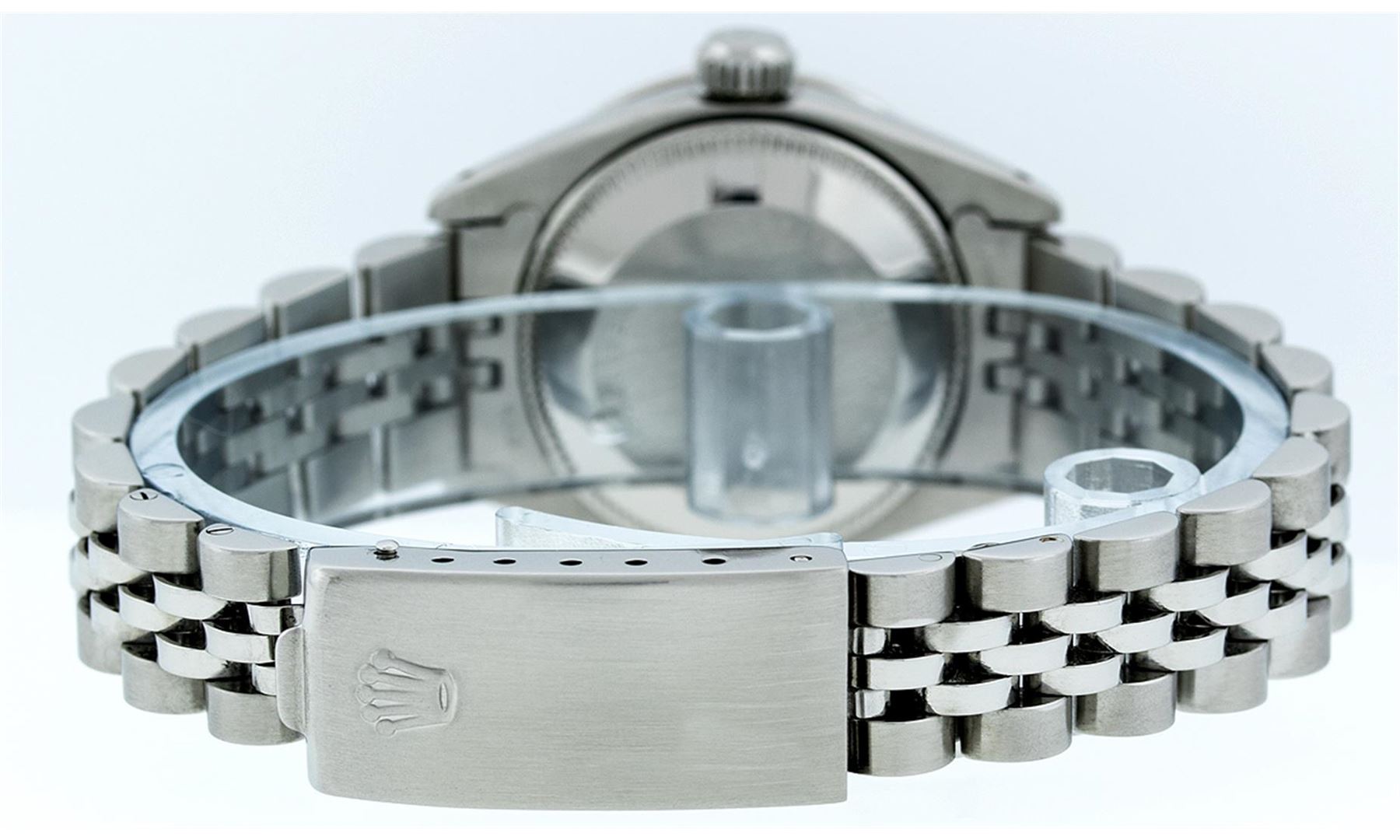 One Ladies Rolex Datejust Polished Bright with Satin Finish, Serviced & Electronically Tested, Stainless Steel Case:26mm, Stainless Steel Crown, Custom Bezel: 18K White Gold Sapphire Beadset Diamond Bezel, Diamond + Gem Count: 28 Diamonds + 4 Sapphires Total Weight .70 Carat, Clarity: SI-VS, Color: G to H. Custom Crystal: Synthetic Sapphire Cyclops Lens. Movement: Automatic Winding Movement Caliber 2030. Custom Dial: Refinished Purple Roman Dial With Square Track. Date Window: 3 O'Clock Position Date Display, Model: Datejust. Condition: G-6 Extra Fine. Bracelet: Stainless Steel Jubilee. Bright Polish & Satin Finish. 5.5 Inch Length, Adjustable. Standard Clasp, With Rolex Logo. Comes with a 6 month warranty card.