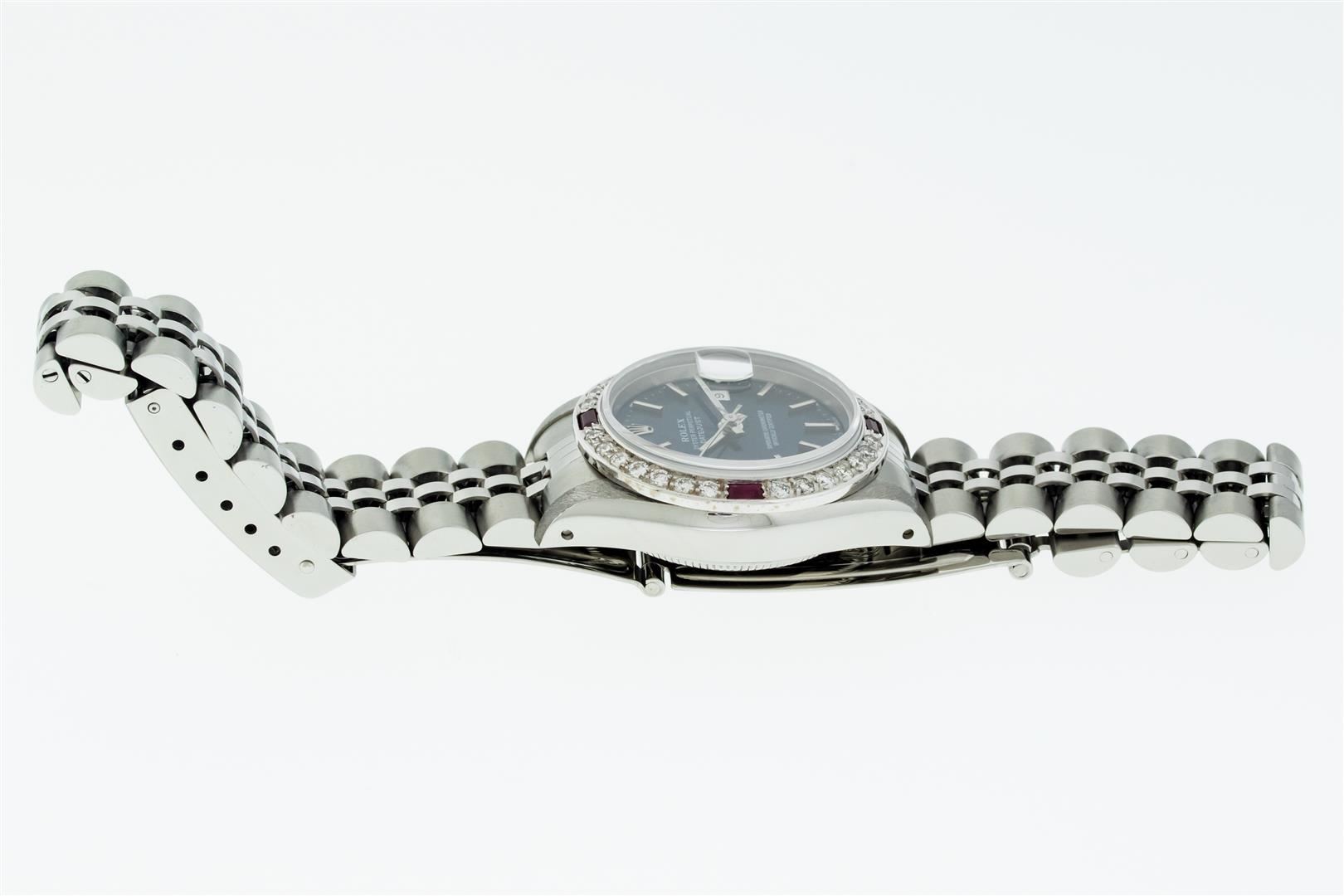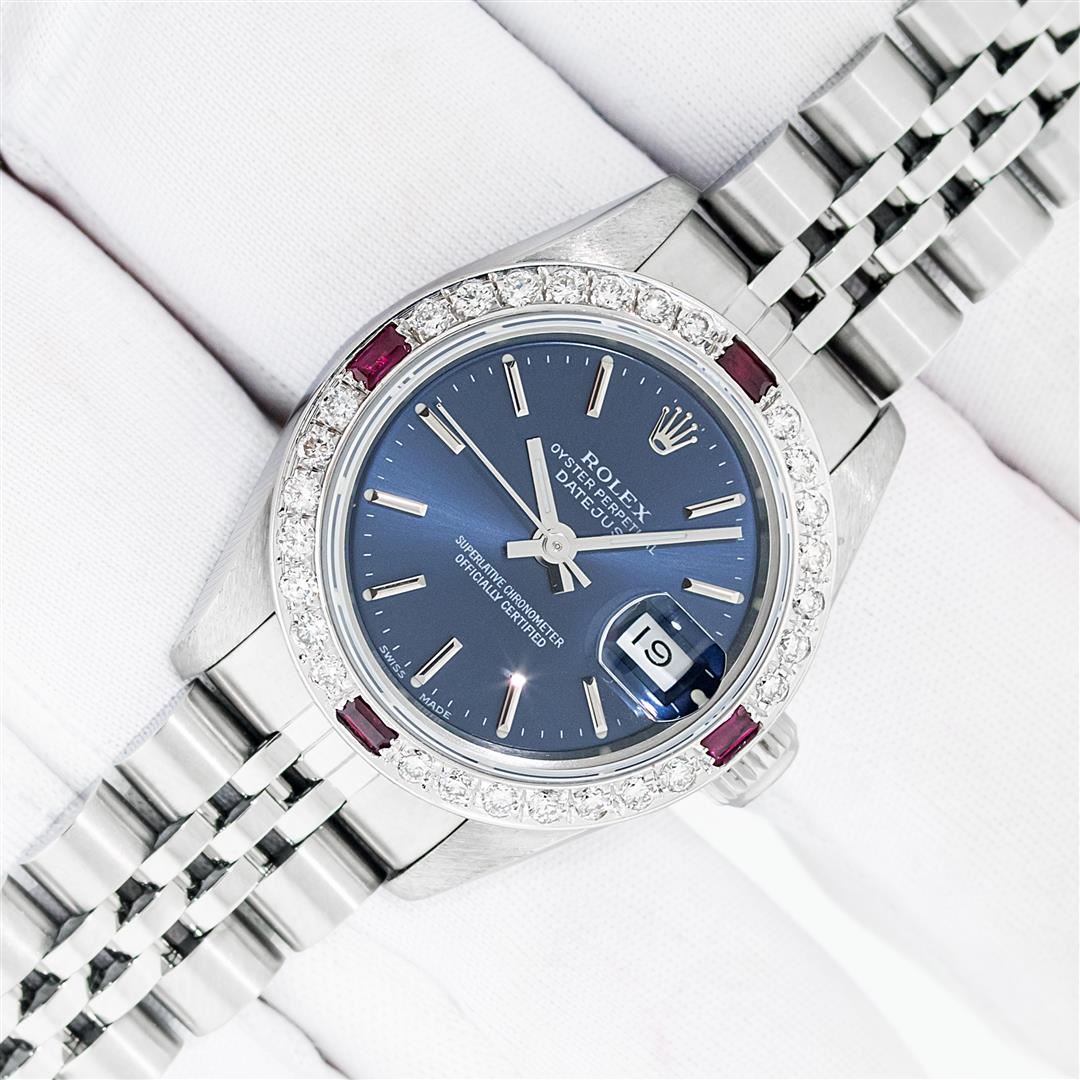 One Ladies Pre Owned Quickset Stainless Steel Rolex Datejust Polished Bright with Satin Finish Serviced & Electronically Tested, Rolex Stainless Steel Case: 26mm, Rolex Stainless Steel Crown, Custom Bezel: New White Gold Beadset + Ruby Diamond Bezel, Diamond Count: 28 Diamonds + 4 Rubies. Custom Crystal: New Sapphire With Date Window. Custom Hands: New Luminescent Hands. Rolex Movement: Automatic Winding Movement. Rolex Dial: Blue Index Dial With Dash Track. Date Window: 3 O'Clock Position Date Display, Model: Datejust. Condition: G-6 Extra Fine. Rolex Bracelet: Stainless Steel Jubilee Band With Rolex Crown On Buckle. Bright Polish & Satin Finish. Band Length: 6.0 Inch Length, Adjustable. Standard Clasp, With Rolex Logo. This Watch Has Been Serviced Time Tested And Is In Excellent Condition It Is Free Of All Scratches And Dents.