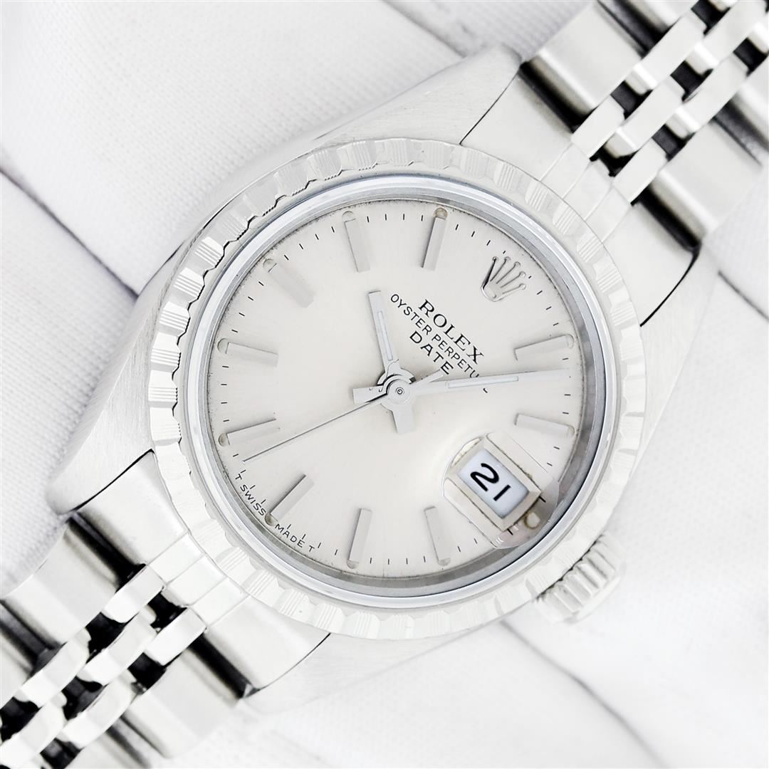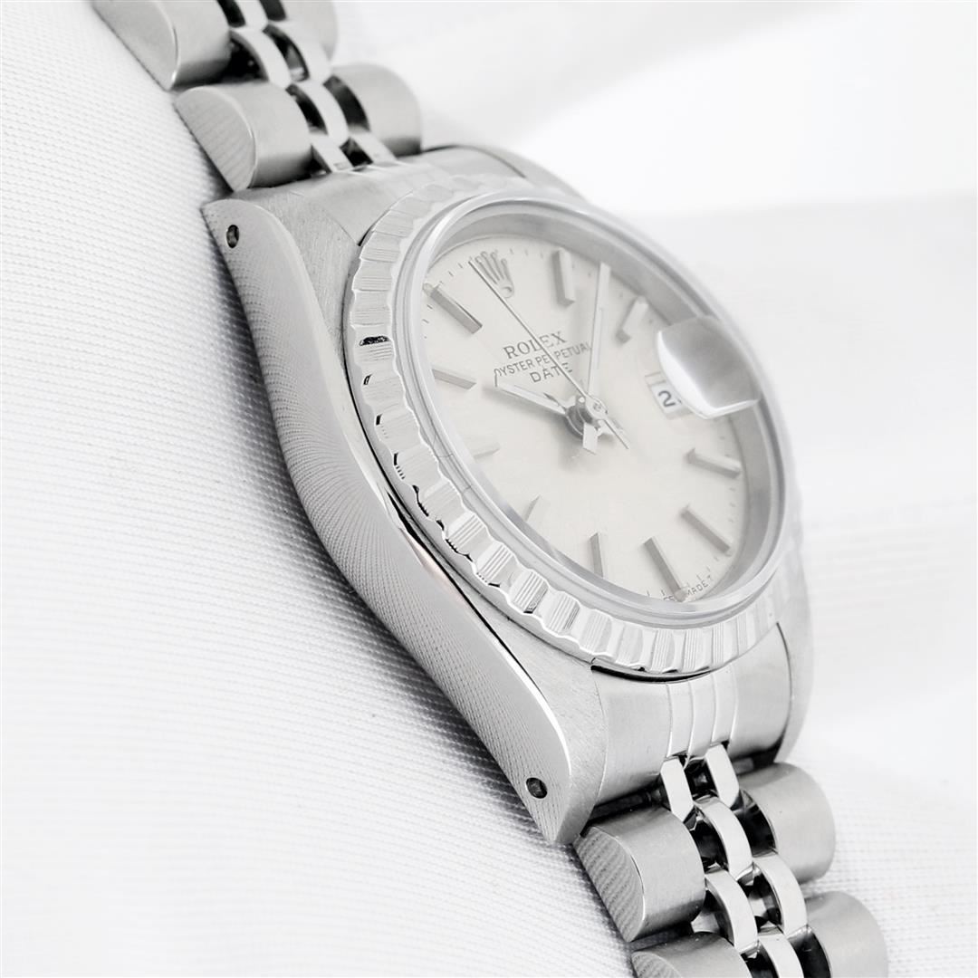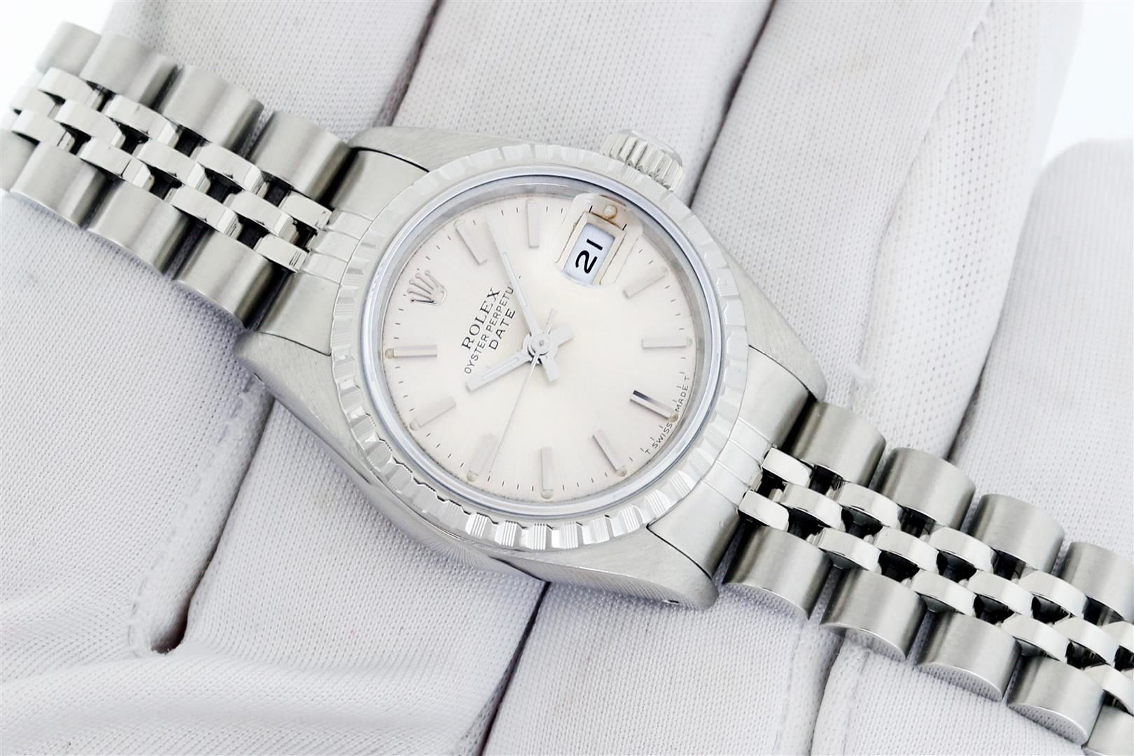 One Ladies Pre Owned Stainless Steel Rolex Datejust Polished Bright with Satin Finish Serviced & Electronically Tested, Rolex Stainless Steel Case: 26mm, Rolex Stainless Steel Crown, Rolex Bezel: Stainless Steel Engine Turn Bezel. Custom Crystal: New Sapphire With Date Window. Custom Hands: New Luminescent Hands. Rolex Movement: Automatic Winding Movement. Rolex Dial: Silver Index Dial With Dash Track And Lumi Dots. Date Window: 3 O'Clock Position Date Display, Model: Datejust. Condition: G-6 Extra Fine. Rolex Bracelet: Stainless Steel Jubilee Band With Rolex Crown On Buckle. Bright Polish & Satin Finish. Band Length: 6.0 Inch Length, Adjustable. Standard Clasp, With Rolex Logo. This Watch Has Been Serviced Time Tested And Is In Excellent Condition It Is Free Of All Scratches And Dents.