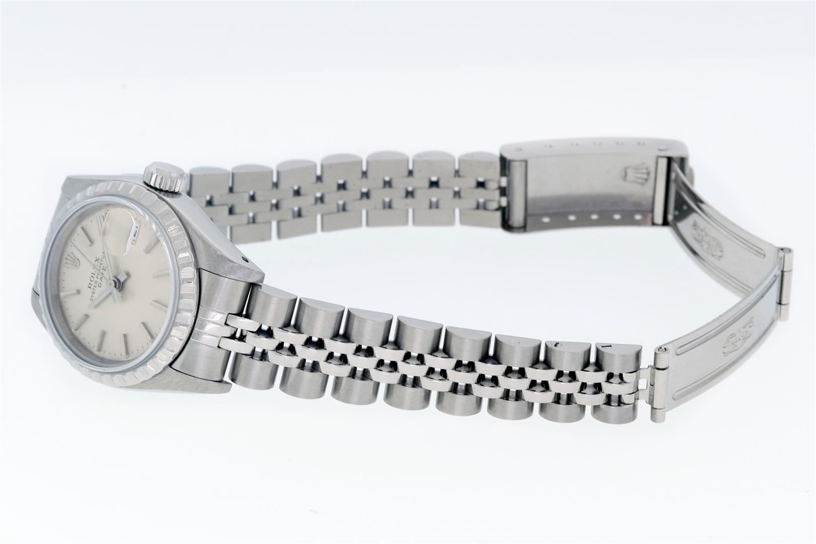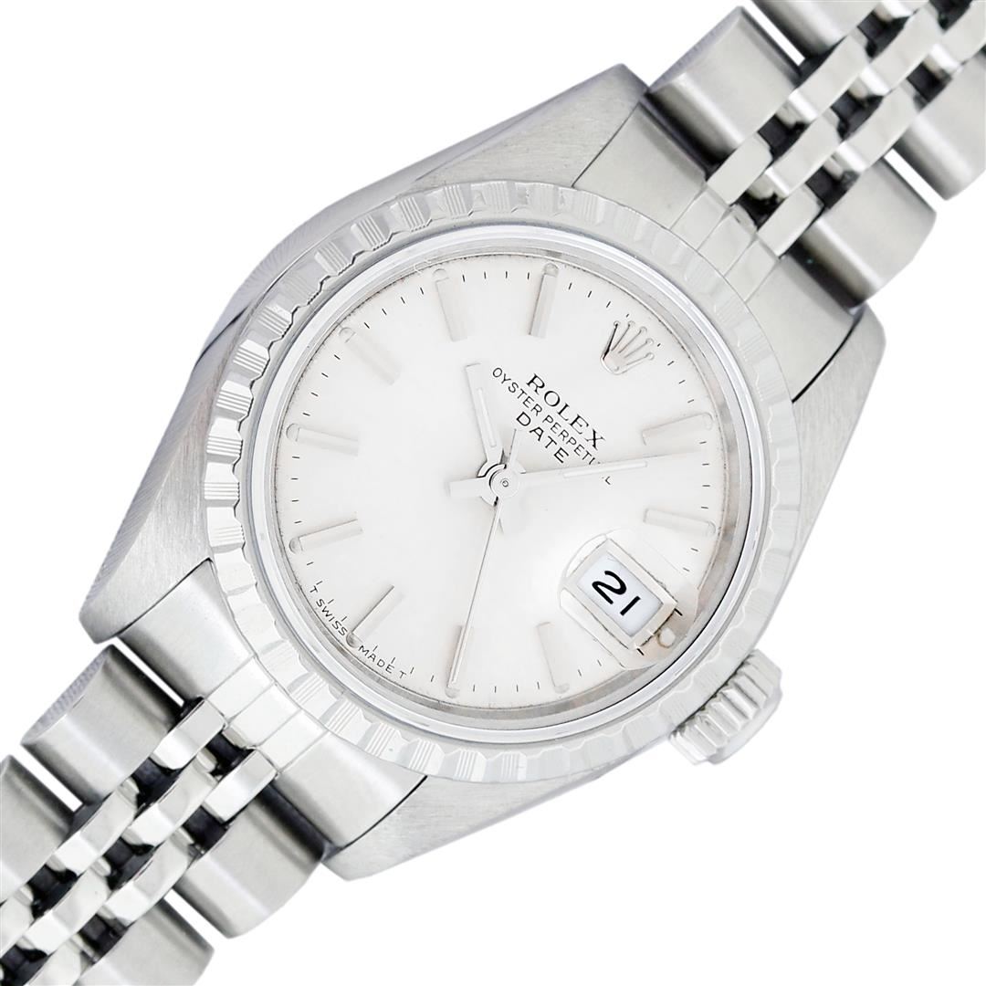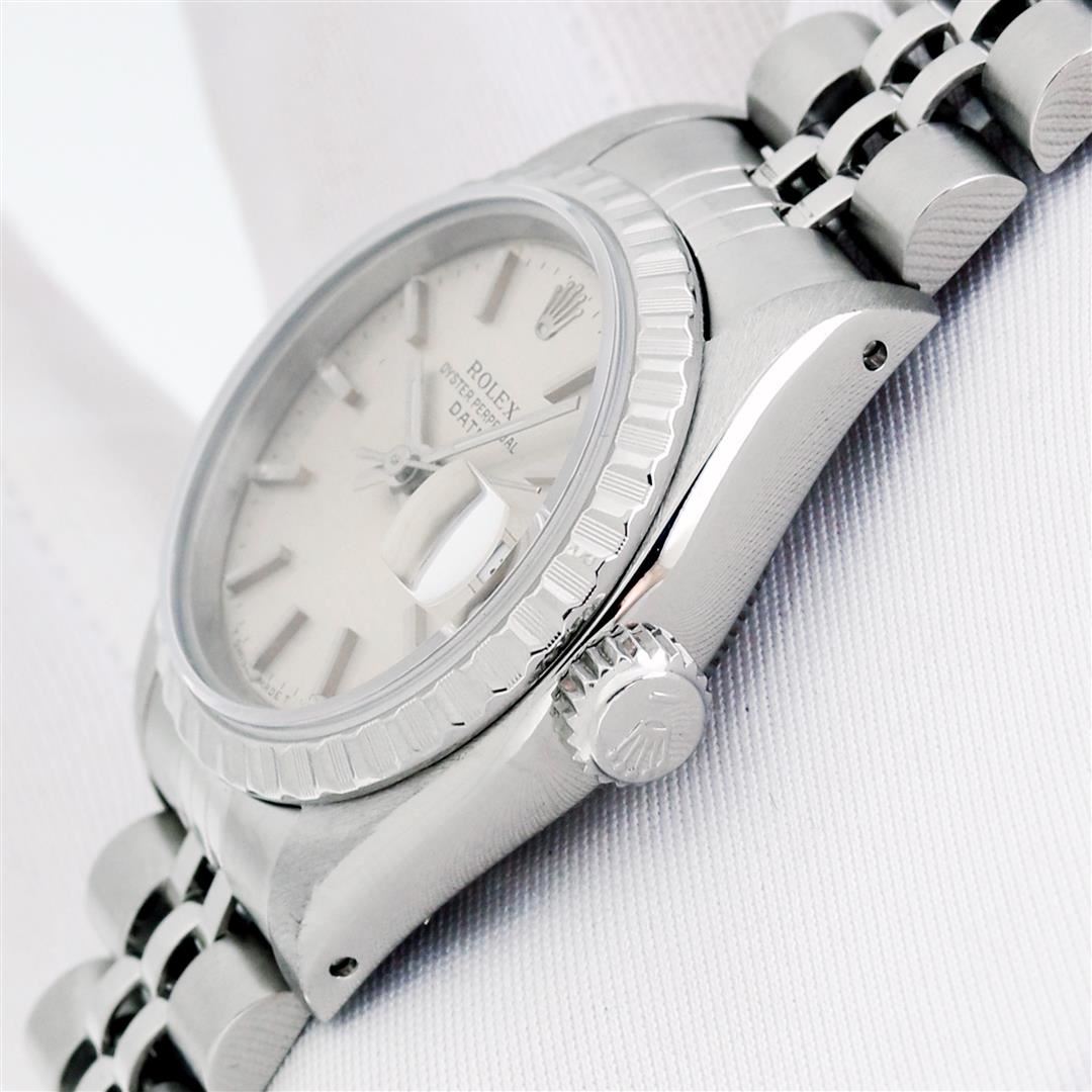 One Ladies Pre Owned Stainless Steel Rolex Datejust Polished Bright with Satin Finish Serviced & Electronically Tested, Rolex Stainless Steel Case: 26mm, Rolex Stainless Steel Crown, Rolex Bezel: Stainless Steel Engine Turn Bezel. Custom Crystal: New Sapphire With Date Window. Custom Hands: New Luminescent Hands. Rolex Movement: Automatic Winding Movement. Rolex Dial: Silver Index Dial With Dash Track And Lumi Dots. Date Window: 3 O'Clock Position Date Display, Model: Datejust. Condition: G-6 Extra Fine. Rolex Bracelet: Stainless Steel Jubilee Band With Rolex Crown On Buckle. Bright Polish & Satin Finish. Band Length: 6.0 Inch Length, Adjustable. Standard Clasp, With Rolex Logo. This Watch Has Been Serviced Time Tested And Is In Excellent Condition It Is Free Of All Scratches And Dents.