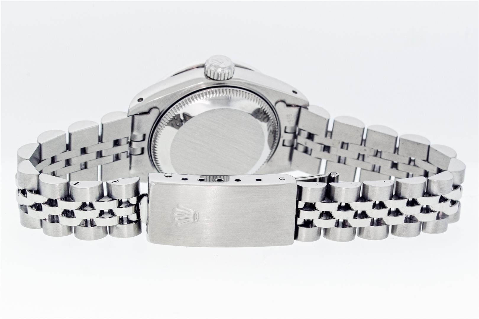 One Ladies Pre Owned Quickset Stainless Steel Rolex Date Polished Bright with Satin Finish Serviced & Electronically Tested, Rolex Stainless Steel Case: 26mm, Rolex Stainless Steel Crown, Custom Bezel: New White Gold Beadset + Ruby Diamond Bezel, Diamond Count: 28 Diamonds + 4 Rubies. Custom Crystal: New Sapphire With Date Window. Custom Hands: New Luminescent Hands. Rolex Movement: Automatic Winding Movement. Rolex Dial: Silver Index Dial With Dash Track And Lumi Dot. Date Window: 3 O'Clock Position Date Display, Model: Datejust. Condition: G-6 Extra Fine. Rolex Bracelet: Stainless Steel Jubilee Band With Rolex Crown On Buckle. Bright Polish & Satin Finish. Band Length: 6.0 Inch Length, Adjustable. Standard Clasp, With Rolex Logo. This Watch Has Been Serviced Time Tested And Is In Excellent Condition It Is Free Of All Scratches And Dents.