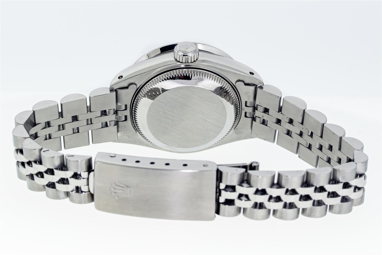 One Ladies Pre Owned Stainless Steel Rolex Date Polished Bright with Satin Finish Serviced & Electronically Tested, Rolex Stainless Steel Case: 26mm, Rolex Stainless Steel Crown, Custom Bezel: New Stainless Steel Beadset Diamond Bezel, Diamond Count: 40 Diamonds On Bezel Dial. Custom Crystal: New Sapphire With Date Window. Custom Hands: New Luminescent Hands. Rolex Movement: Automatic Winding Movement. Rolex Dial: Blue Index Dial With Dash Track And Lumi Dots. Date Window: 3 O'Clock Position Date Display, Model: Datejust. Condition: G-6 Extra Fine. Rolex Bracelet: Stainless Steel Jubilee Band With Rolex Crown On Buckle. Bright Polish & Satin Finish. Band Length: 6.0 Inch Length, Adjustable. Standard Clasp, With Rolex Logo. This Watch Has Been Serviced Time Tested And Is In Excellent Condition It Is Free Of All Scratches And Dents.