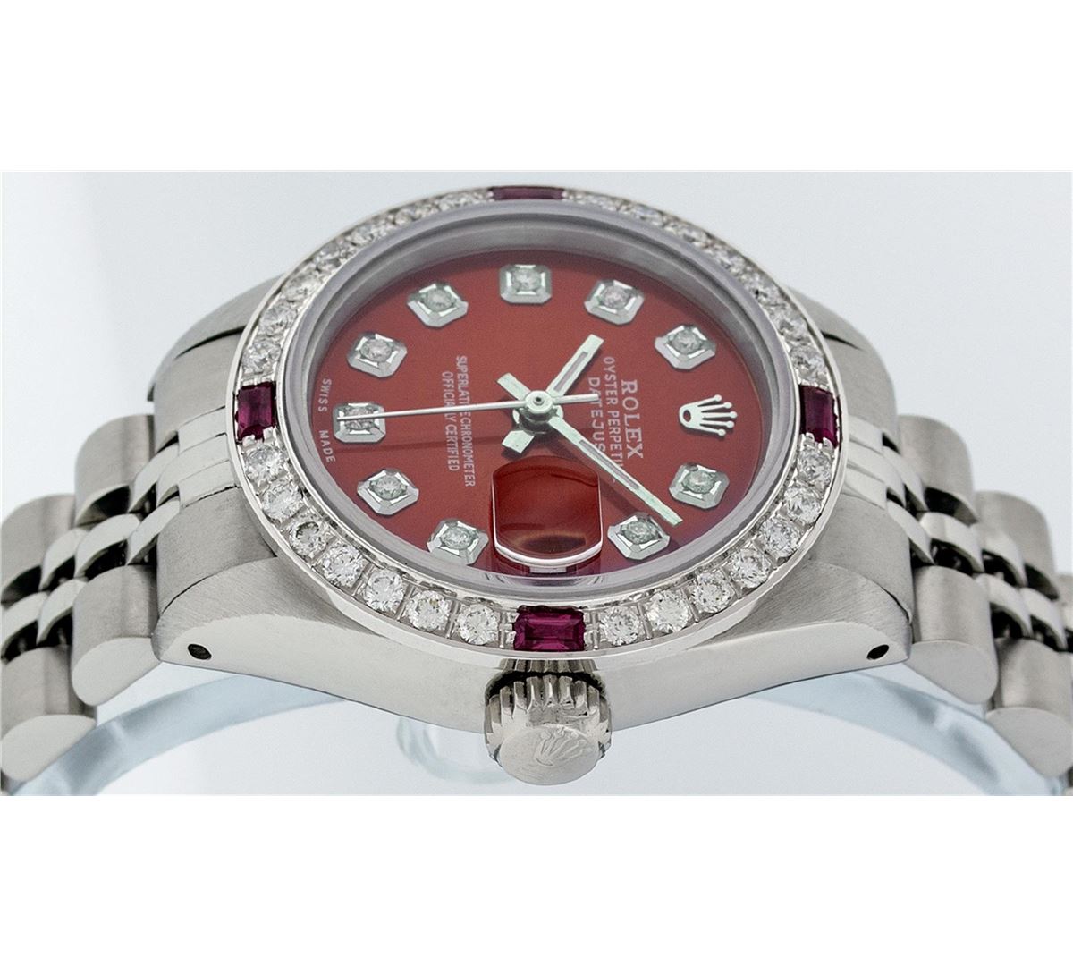 Ladies Rolex Datejust Polished Bright with Satin Finish, Serviced & Electronically Tested, Stainless Steel Case:26mm, Stainless Steel Crown, Custom Bezel: 18K White Gold Ruby Beadset Diamond Bezel, Diamond + Gem Count: 28 Diamonds + 4 Rubies Total Weight .70 Carat, Clarity: SI-VS, Color: G to H. Custom Crystal: Synthetic Sapphire Cyclops Lens. Movement: Automatic Winding Movement Caliber 2030. Custom Dial: Refinished Red Diamond Dial. Diamond Count: 10 Diamonds In Dial, Color: G To H, VS SI1. Date Window: 3 O'Clock Position Date Display, Model: Datejust Condition: G-6 Extra Fine. Bracelet: Stainless Steel Jubilee. Bright Polish & Satin Finish. 5.5 Inch Length, Adjustable. Standard Clasp, With Rolex Logo.